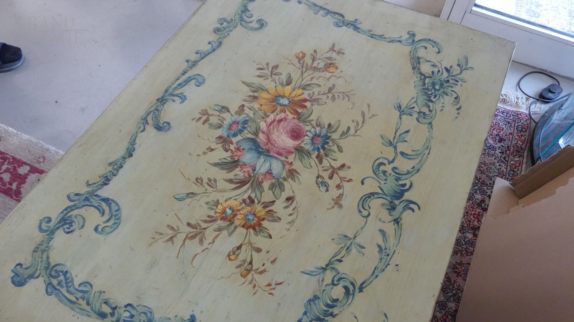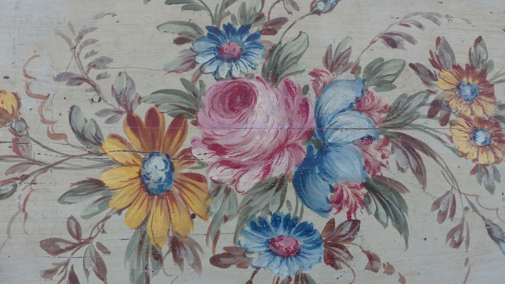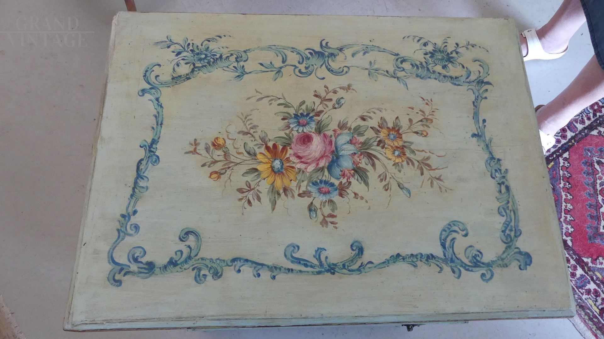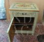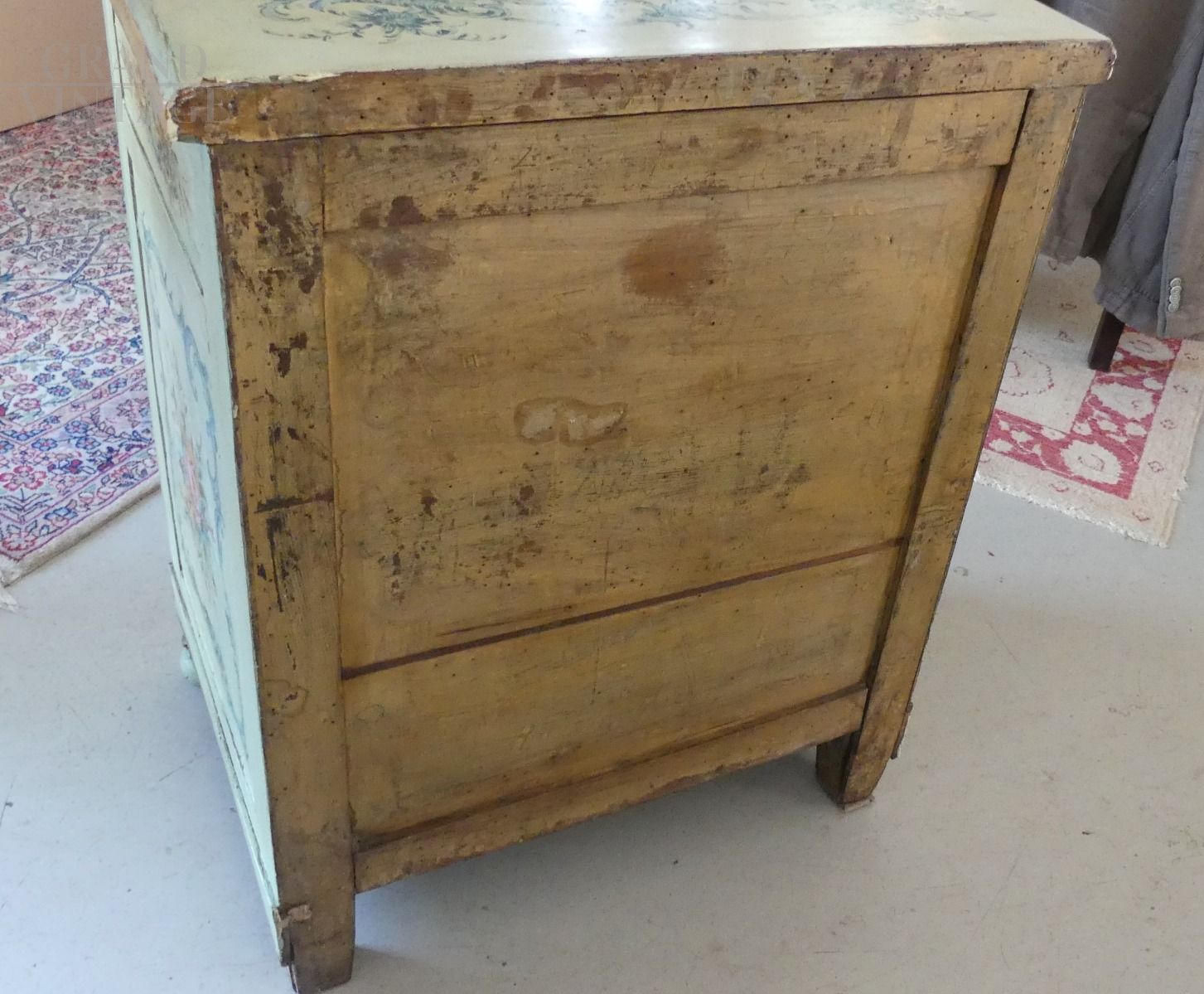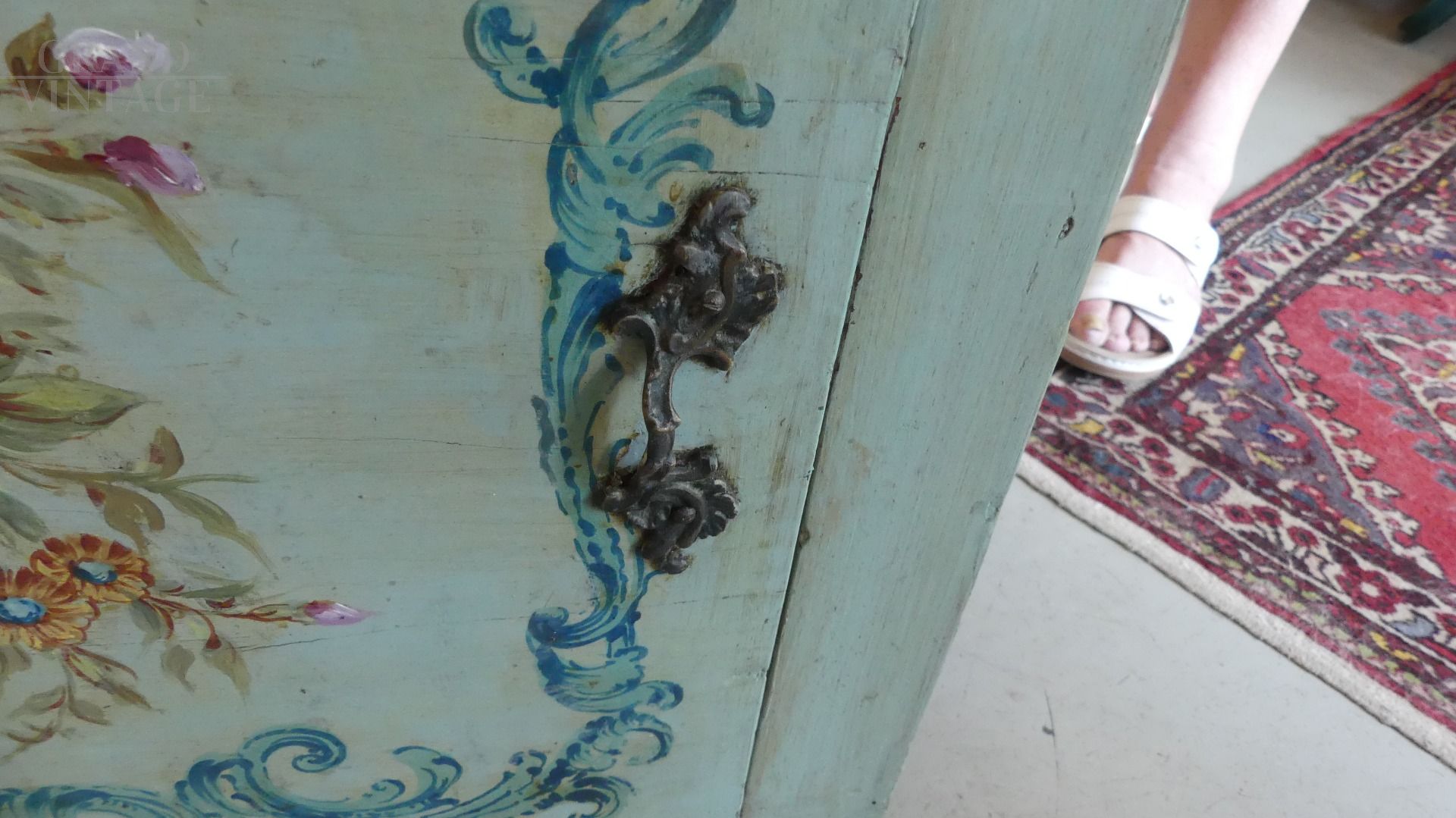 Antique Venetian bedside cabinet in soft fir and walnut wood, lacquered in a very light green color and hand painted with wonderful floral decorations on the top, front and sides.