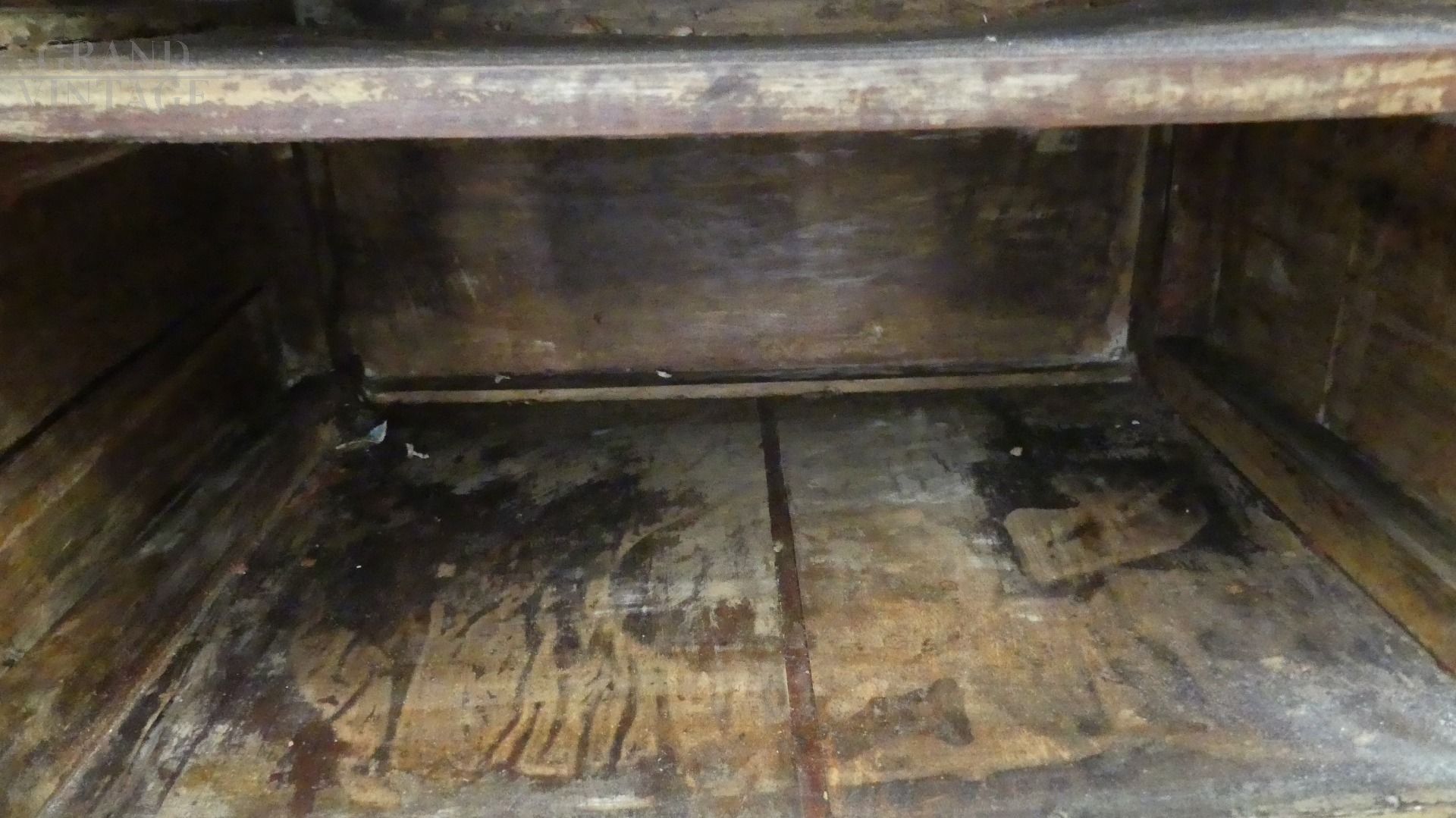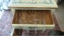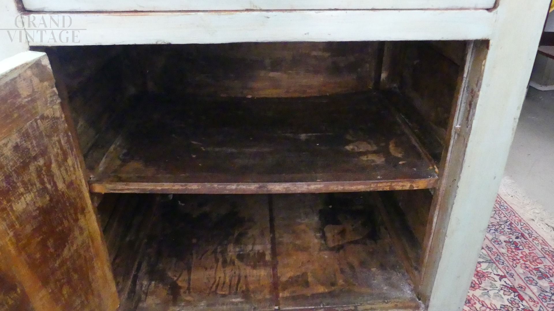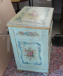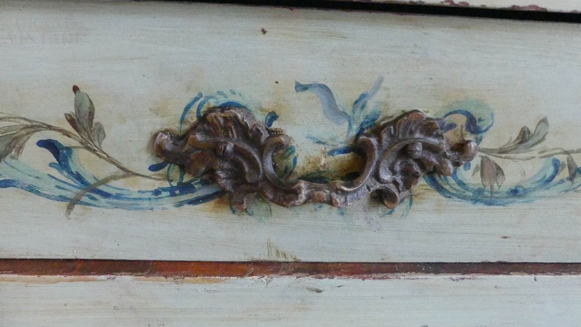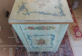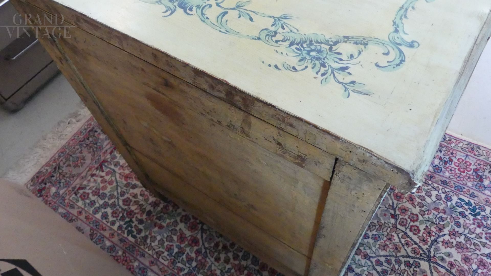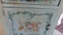 Antique Venetian bedside cabinet in soft fir and walnut wood, lacquered in a very light green color and hand painted with wonderful floral decorations on the top, front and sides.