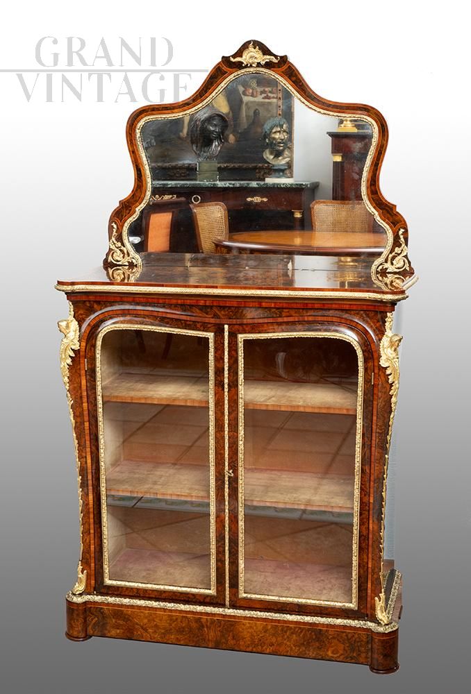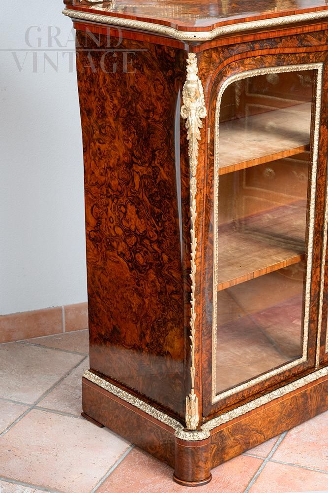Antique English vitrine from the Victorian era in walnut briar with expertly chiseled gilded bronze elements. The front elevation is characterized by two glass doors inside which there are two shelves for storing objects. The top is in walnut briar surrounded by a precious wood reserve and ending with a gilded bronze fitting. The cymatium has the same structure as the piece of furniture underneath and has a mirror from the same period.