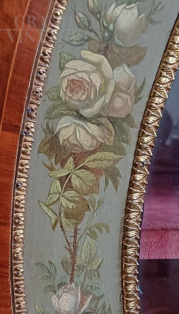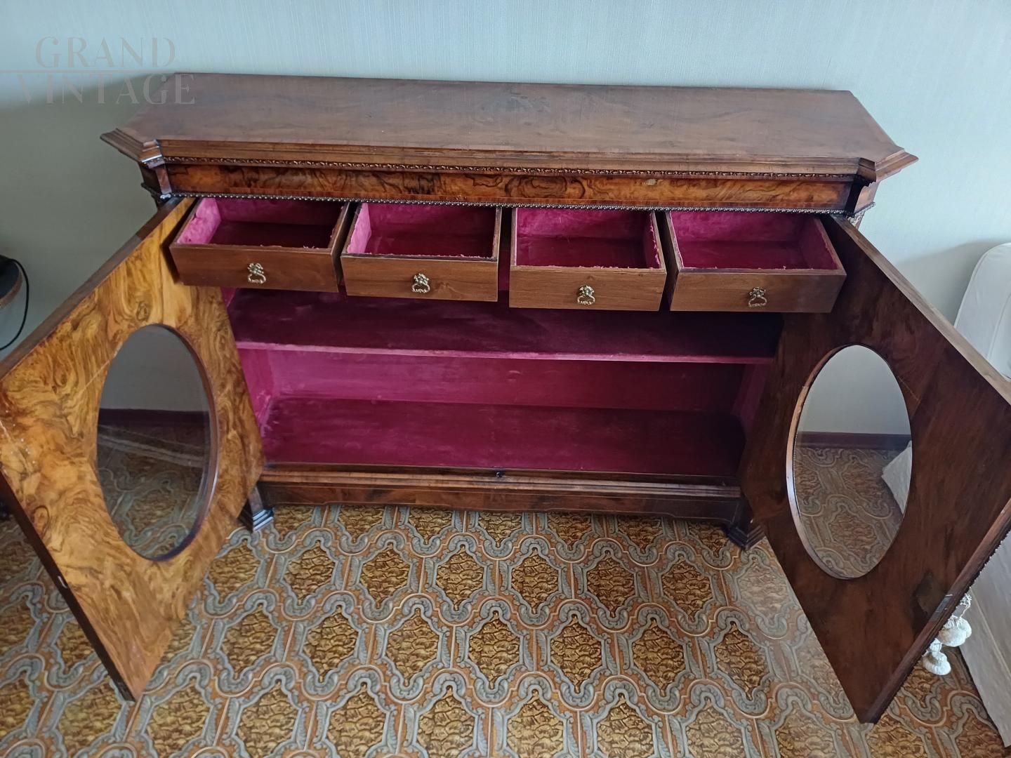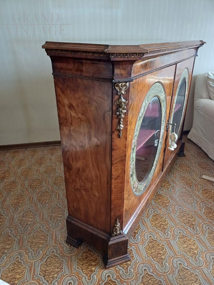 Antique Victorian two-door walnut burl sideboard from the second half of the 19th century. It features two large doors with oval glass windows framed by an elegant hand-painted floral decoration on a sage green background, enhanced by gilded embossed frames. Chiseled gilt bronze friezes line the sides and the top cornice. The interior is lined in purple velvet, with two levels and four drawers. The original lock with a working key is still in place.