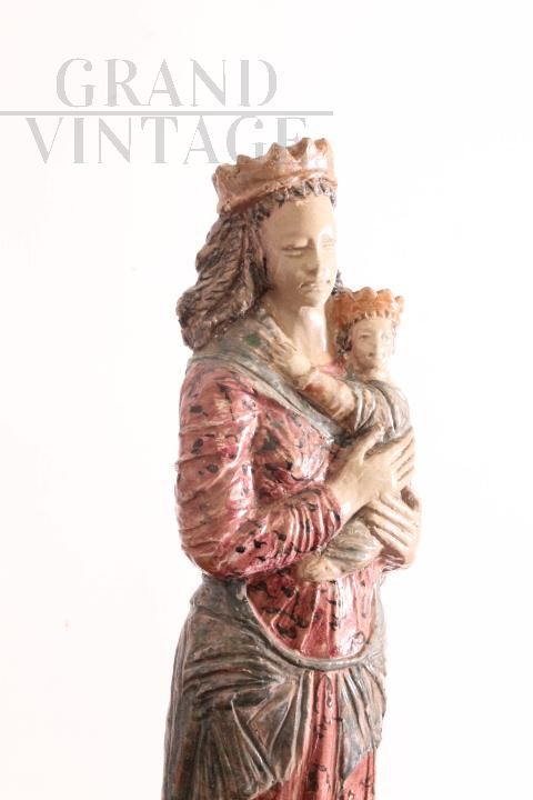 Antique sculpture Virgin with Jesus in polychrome majolica, made by the artist Benini in the 1950s.