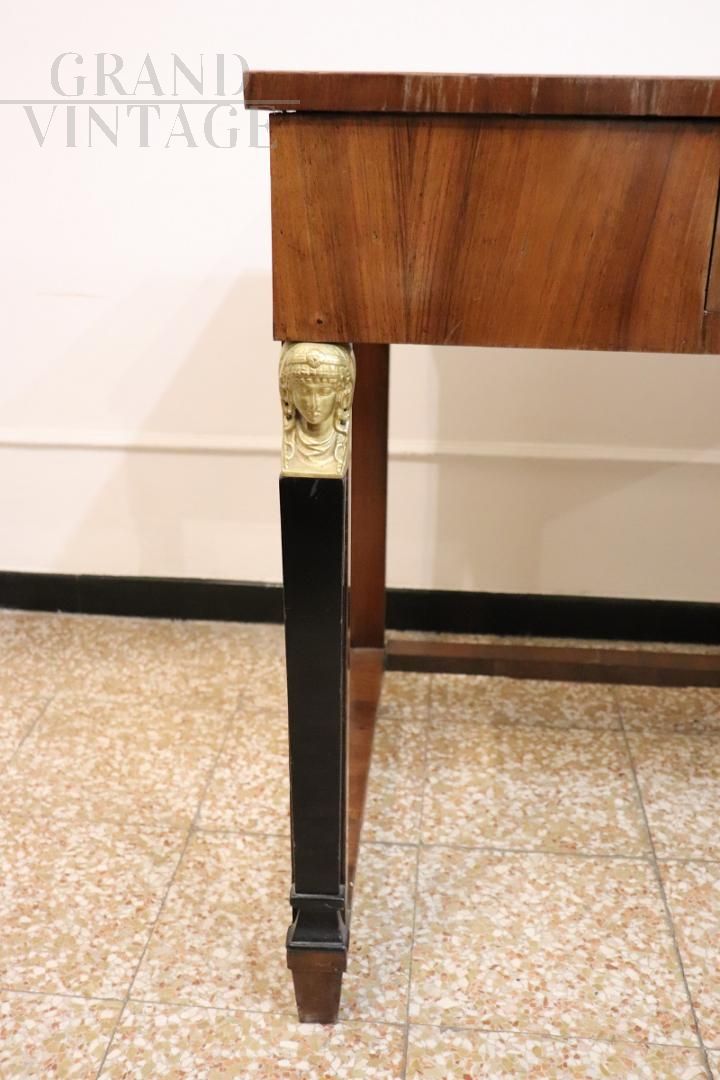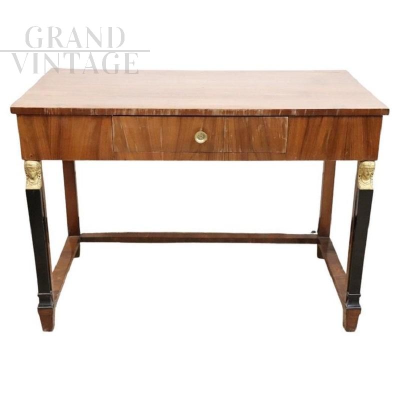 Antique Italian desk dating back to the early 19th century, during the sumptuous Empire period. This desk, crafted from fine walnut, is characterized by refined linearity. On the front, two black pilasters with a finely gilded bronze caryatid capital create a visual accent that captures the eye and adds a touch of luxury. Practically speaking, it features a drawer for storing small items and a surface large enough to be perfect for home office work. Please note that this desk was designed to be placed against a wall; the back is made of unfinished wood. Leg room from the floor is 60 cm. Price negotiable.