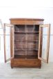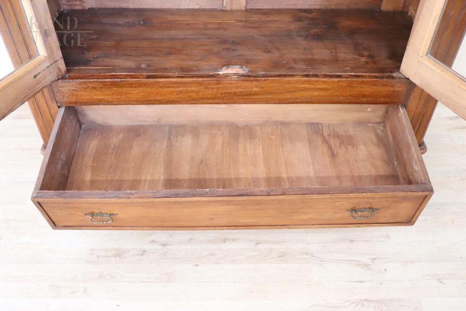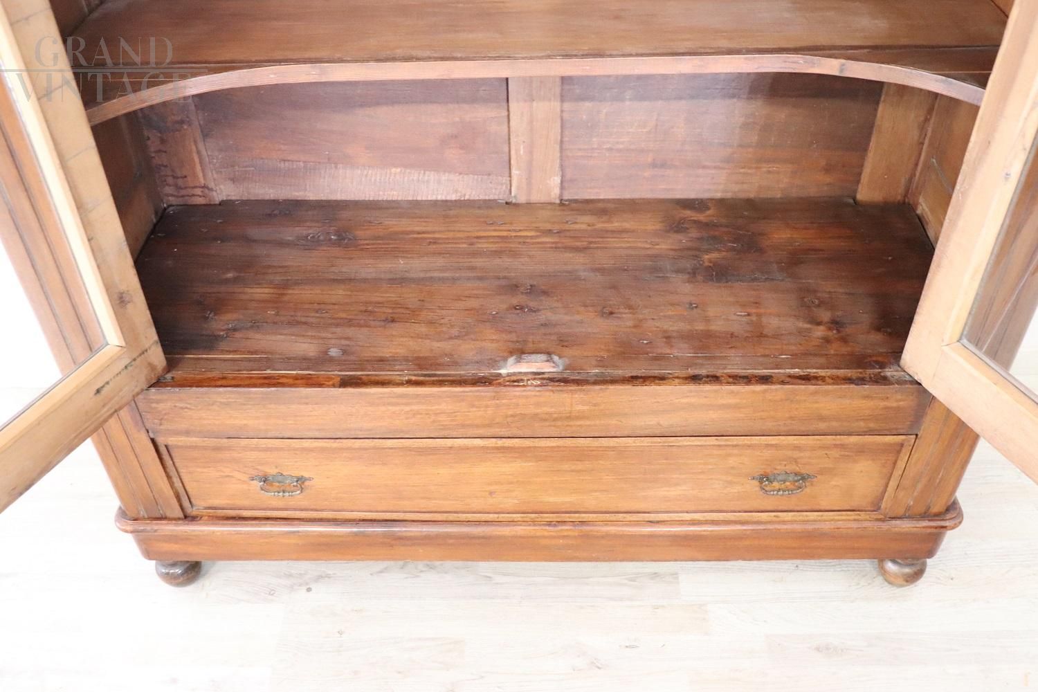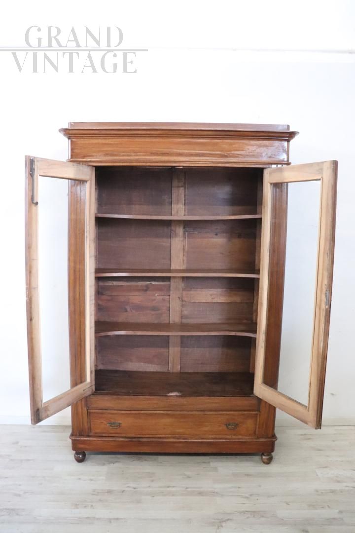 Beautiful antique bookcase cupboard in walnut with two glass doors, datable to the second half of the 19th century, characterized in the upper part by glass doors to display objects or books in sight, while in the lower part it has a practical drawer. Ample internal usable space with three solid shelves available. Very simple and linear, it can be easily inserted into any style of environment. Used, in good condition. Price negotiable.