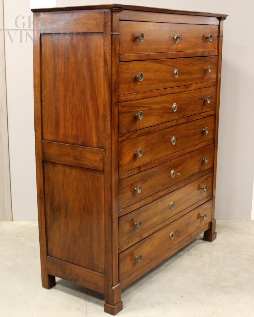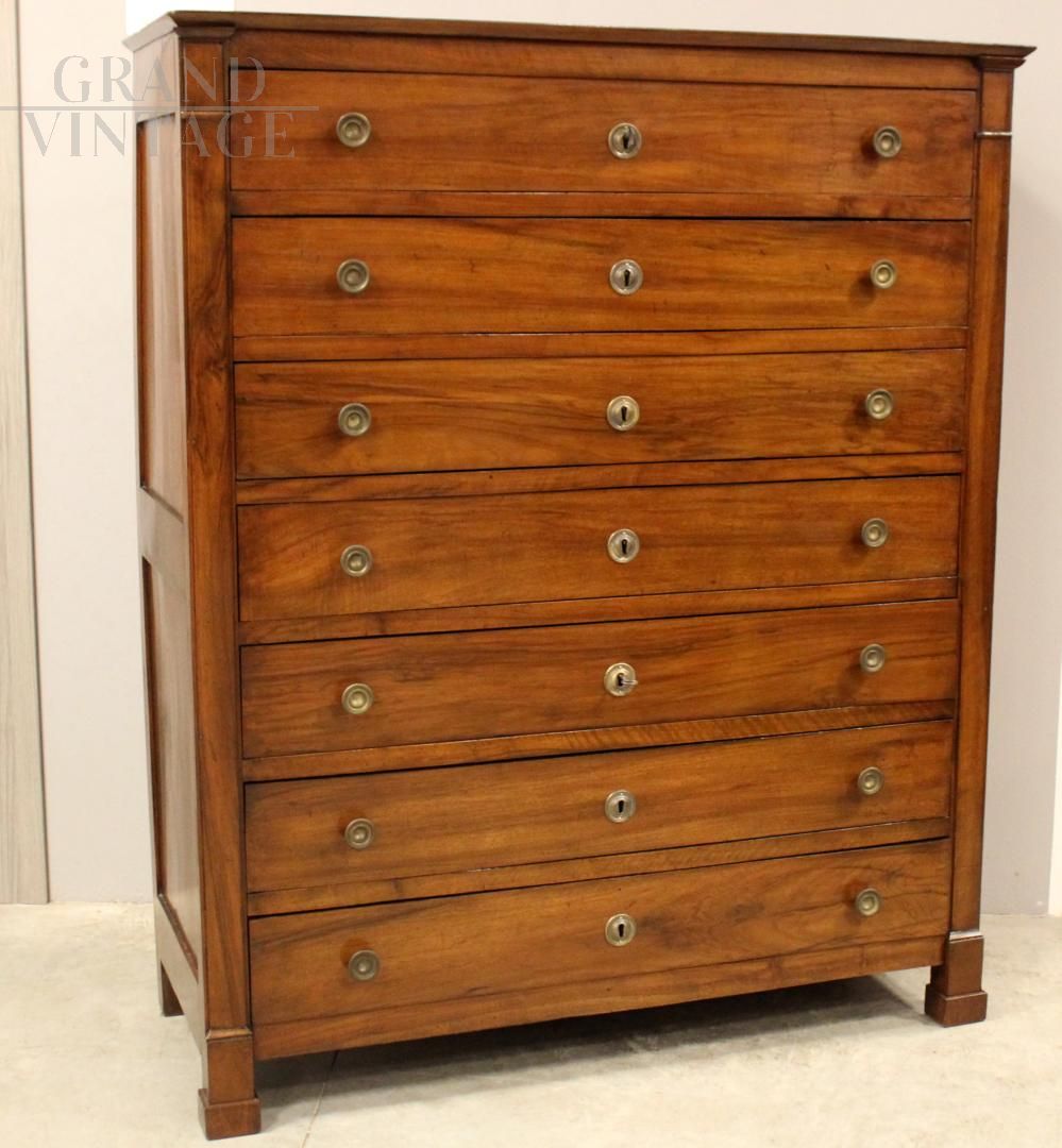Antique Empire era tallboy dresser chest of drawers in solid walnut with 7 drawers, made in Italy in the early 19th century, restored.