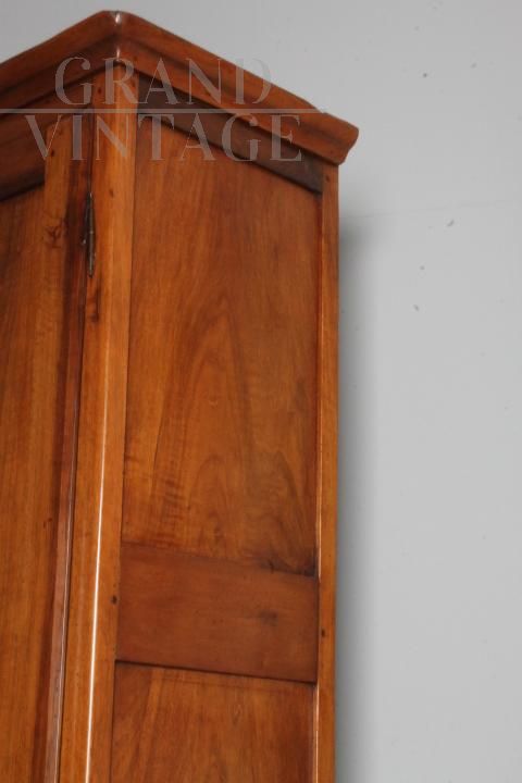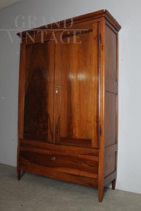 Antique walnut cabinet from the late 18th century, with simple, clean lines, two doors with a hanging rod and a lower drawer. A single, non-detachable body, with truncated pyramidal legs and a rounded frame above. Attractive dimensions! The piece has been restored and is ready to be placed in a room.
