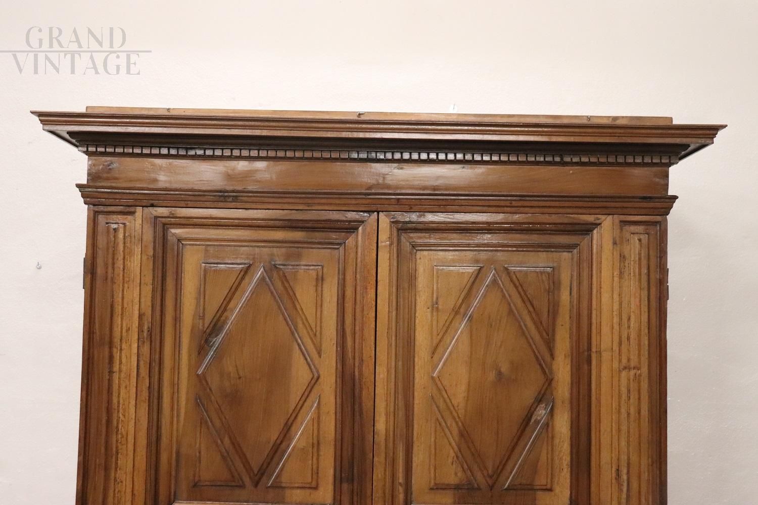 Rare and important antique Italian wardrobe in solid walnut made towards the end of the 17th century from the Louis XIV period. The line is in fact typical of this period of high times that wanted this type of furniture of great grandeur made of solid walnut. Characterized by doors and sides with decorative panels with a geometric pattern. Internally it is equipped with a rod for hanging clothes, originally there were shelves that have been lost. Shelves can be added if the customer wishes. It features the seventeenth-century nail and hardware store. The hat is equipped with a secret compartment, the top rises up and can store confidential items. Wardrobe of rare importance. Price negotiable.
