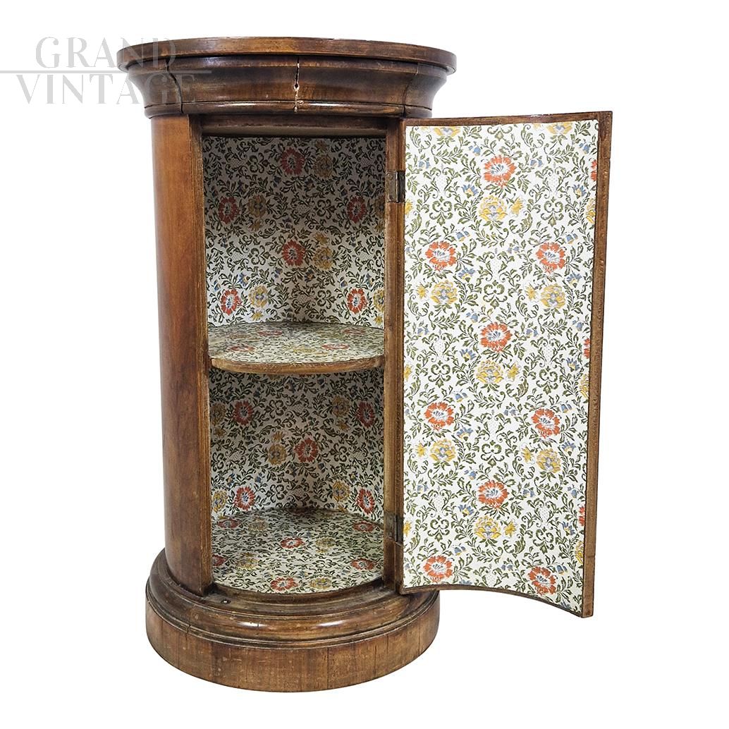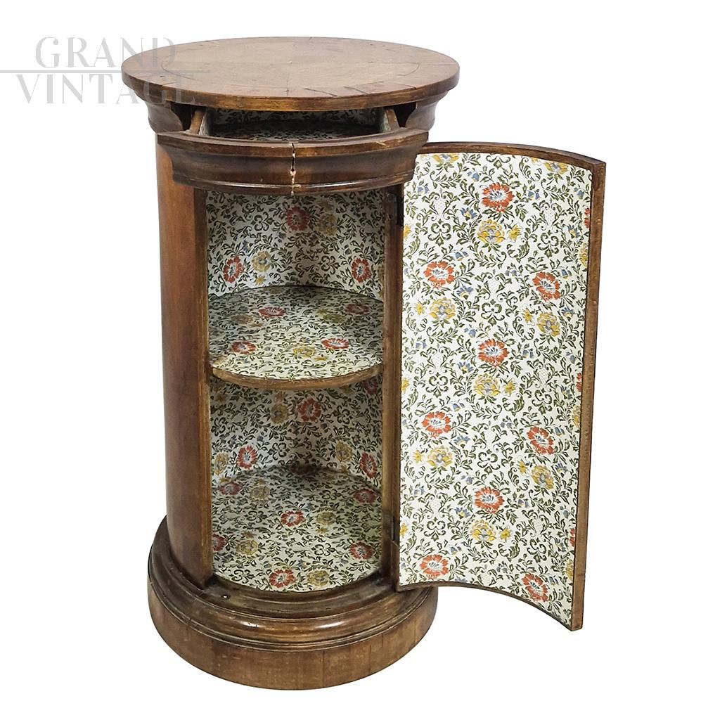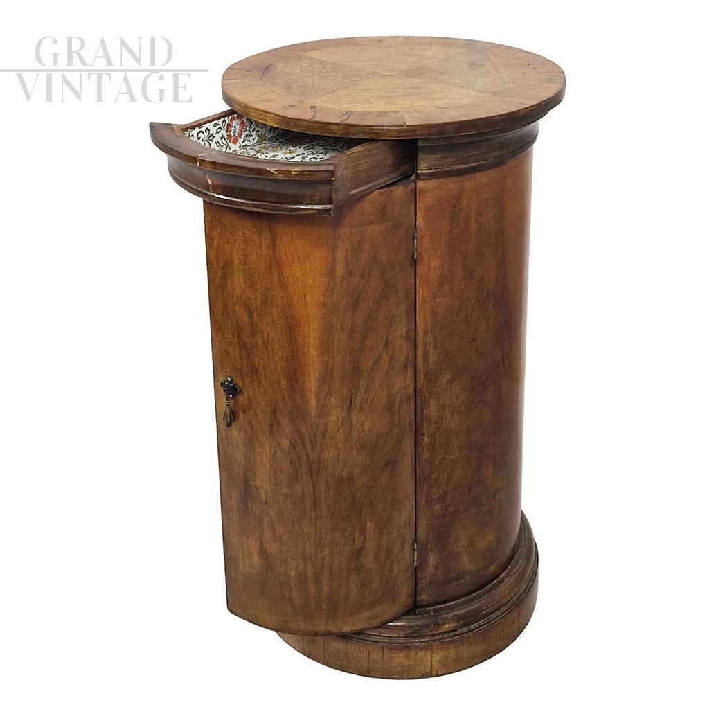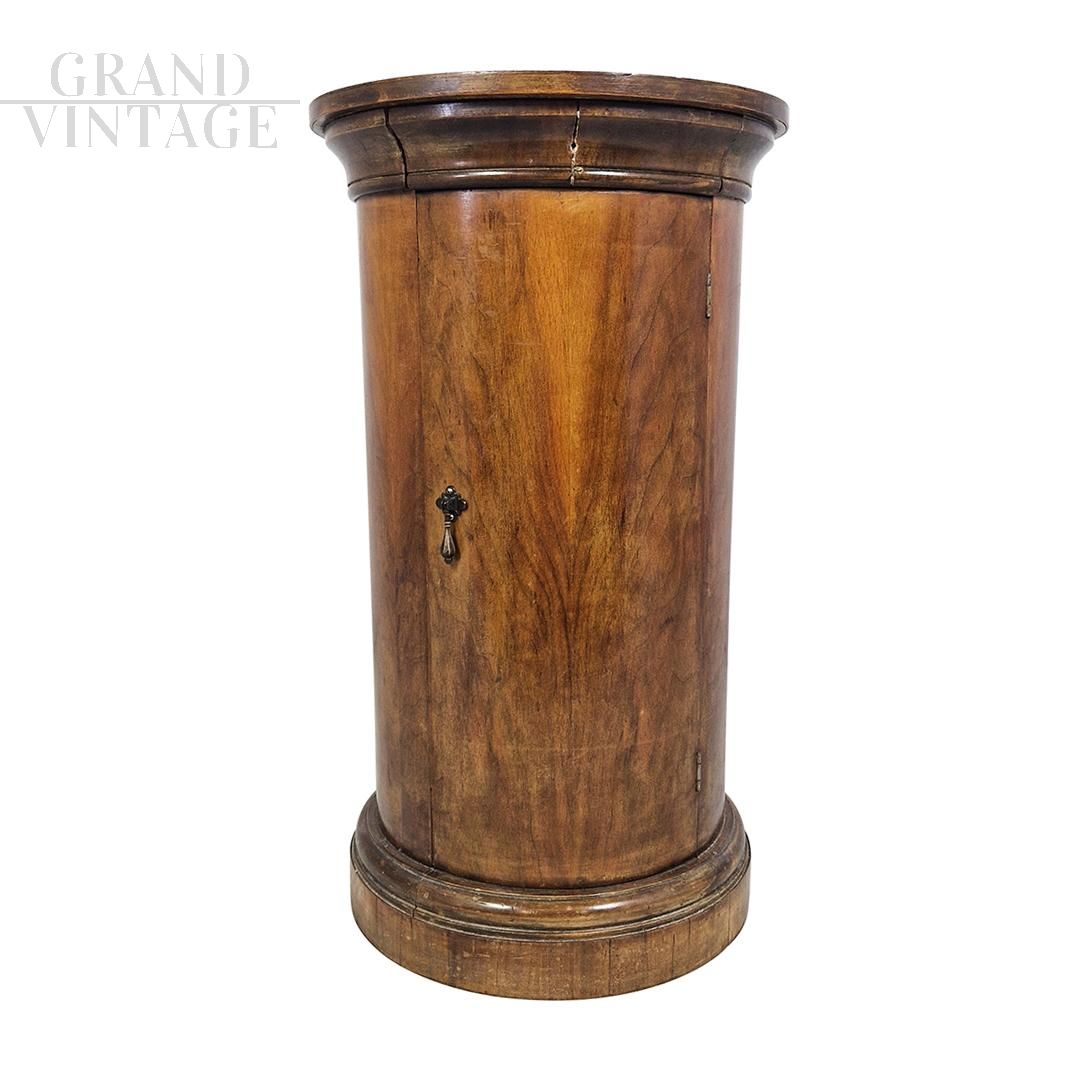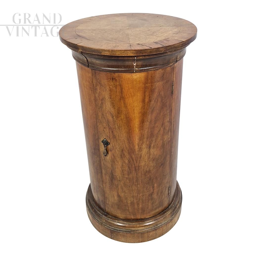 Antique wooden column or cylinder bedside table, with a door concealing a central shelf and a drawer under the top. 3 pieces available.