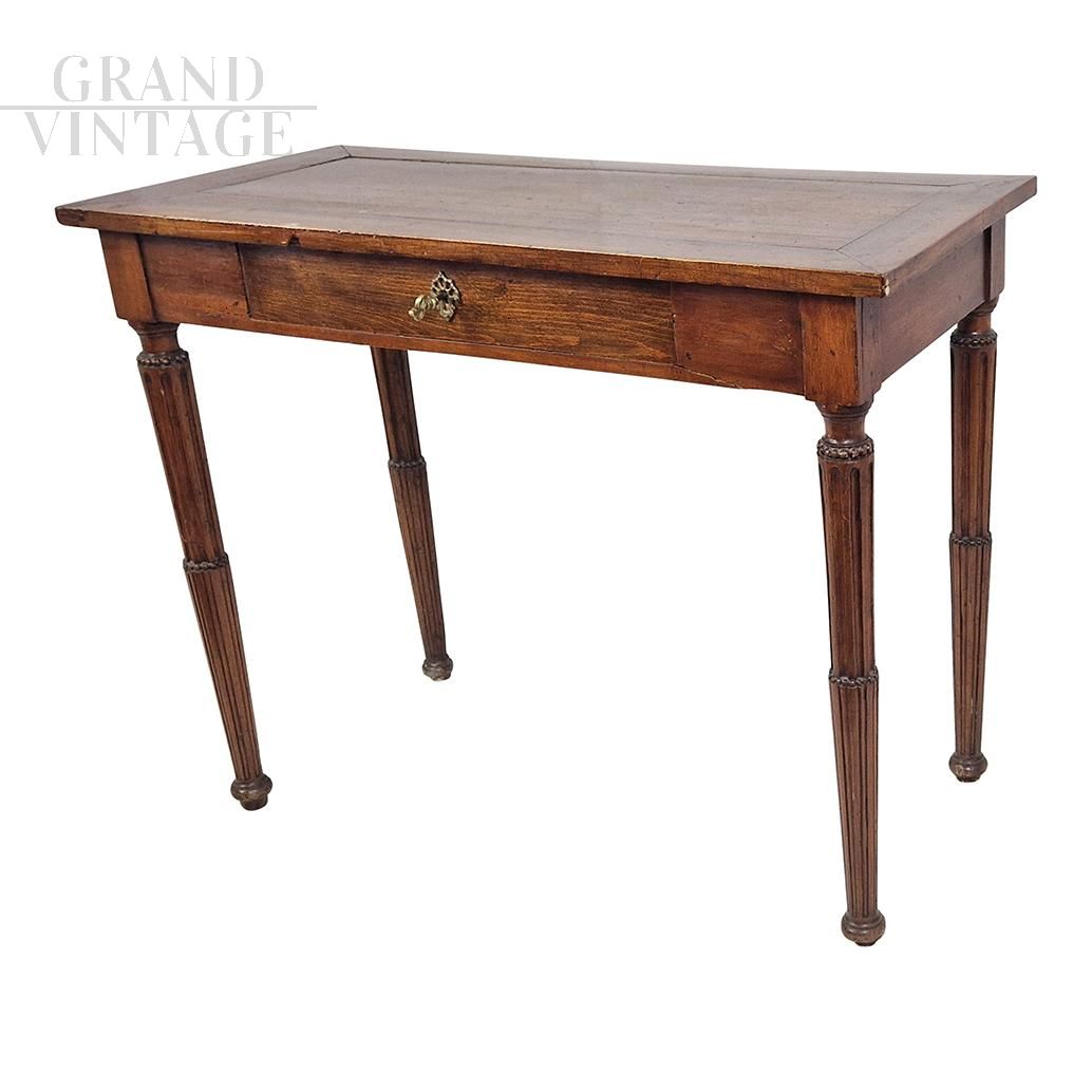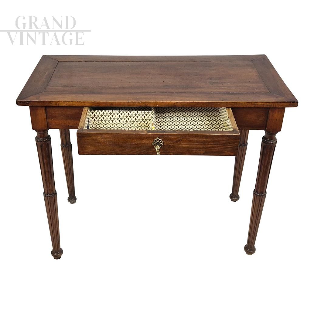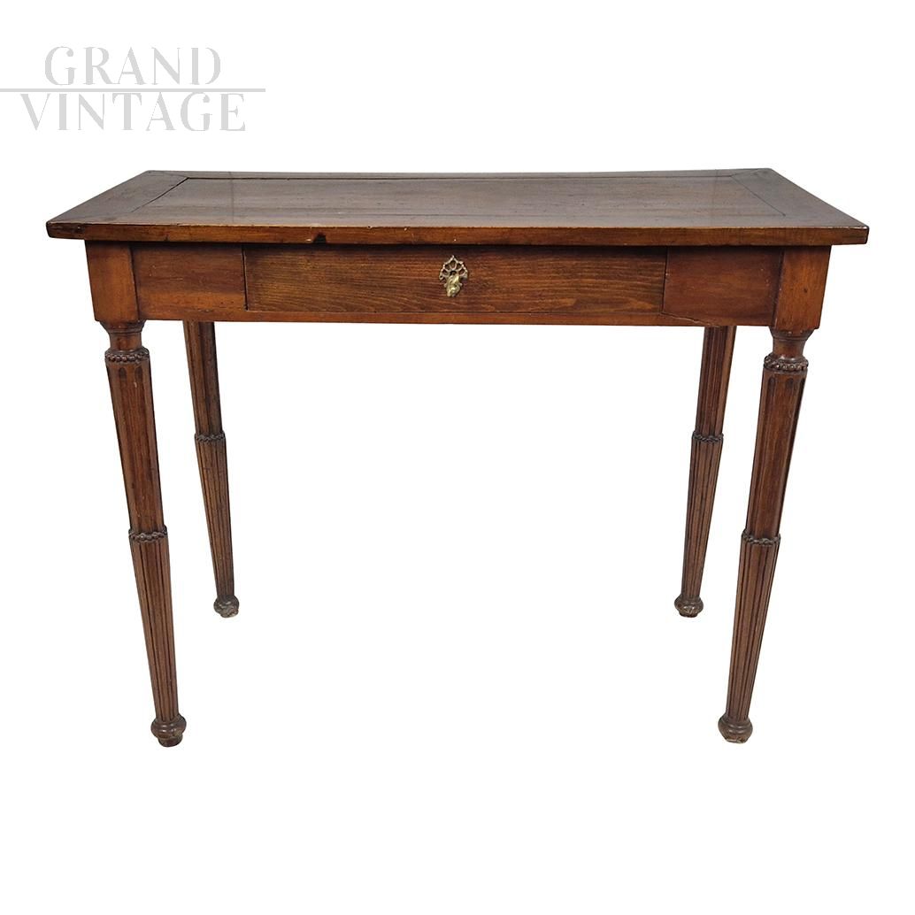 Antique game or side table from the late 19th century in fine wood, with high and fluted legs in a truncated pyramid shape and a drawer on the band.