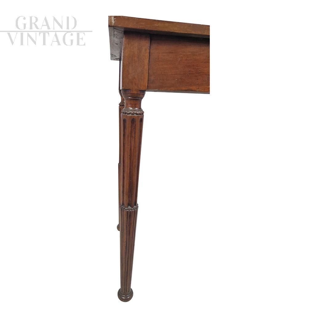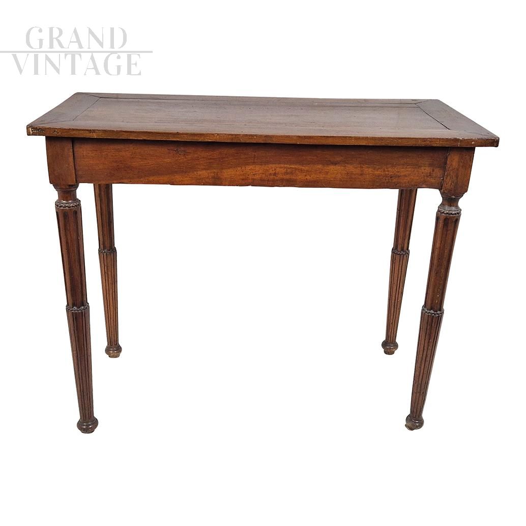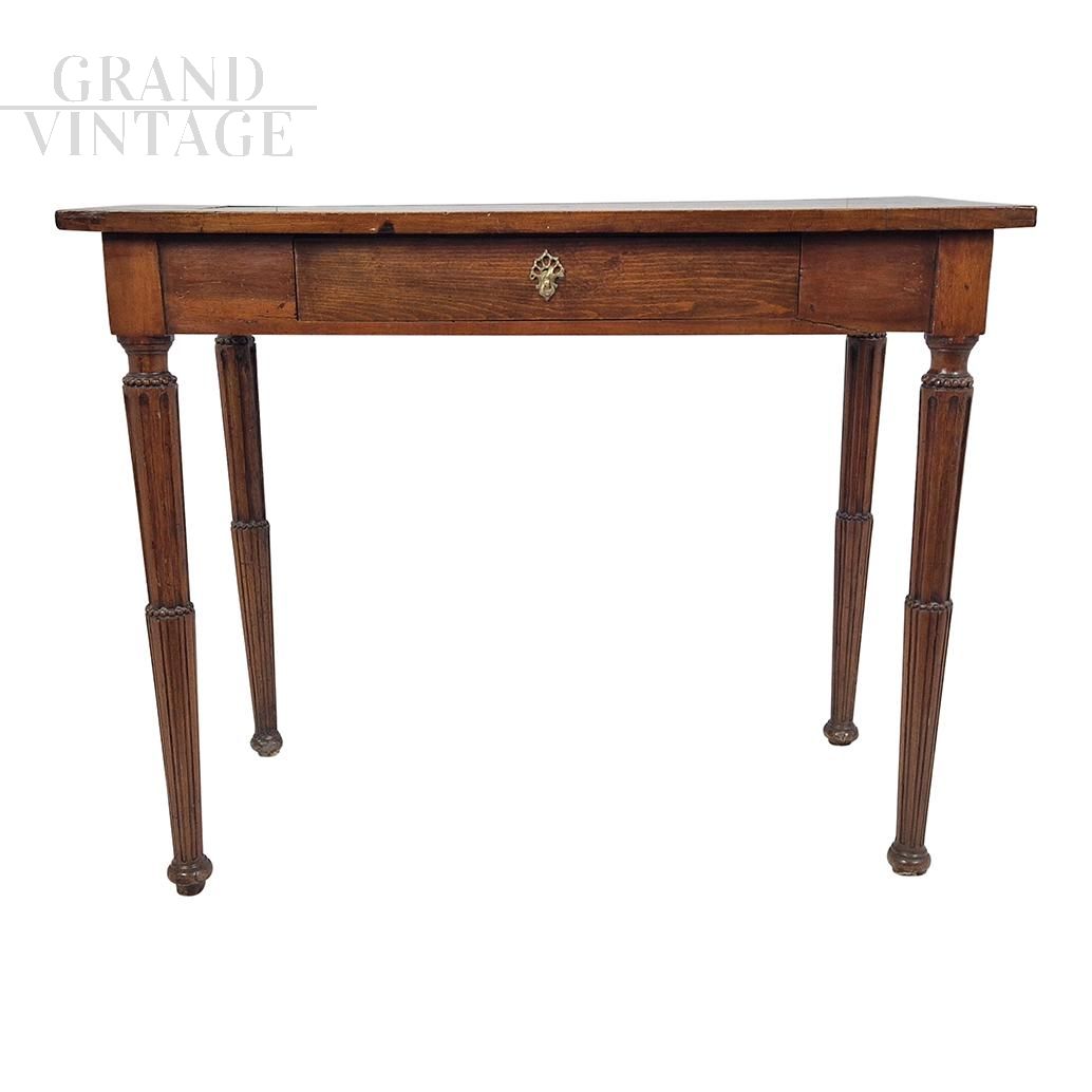 Antique game or side table from the late 19th century in fine wood, with high and fluted legs in a truncated pyramid shape and a drawer on the band.