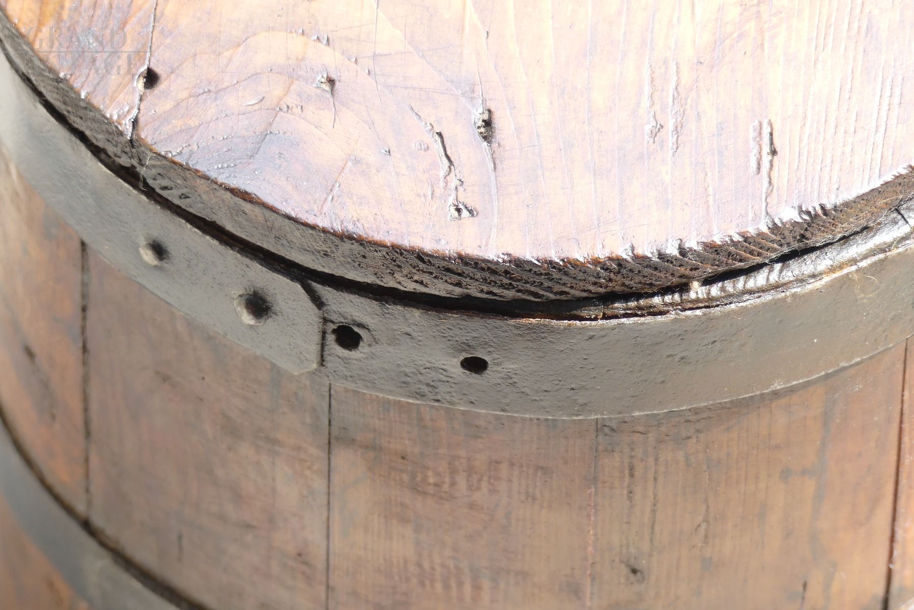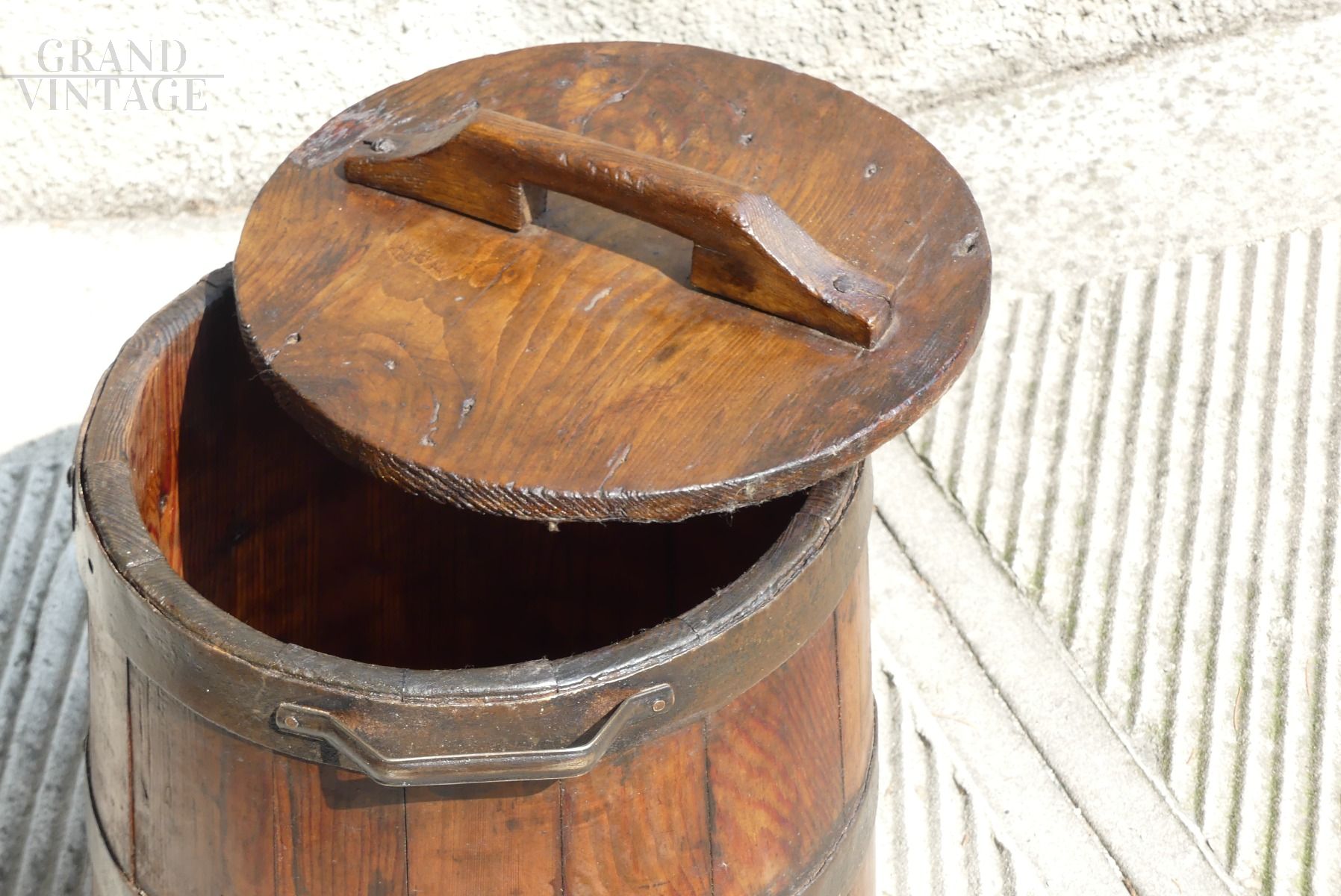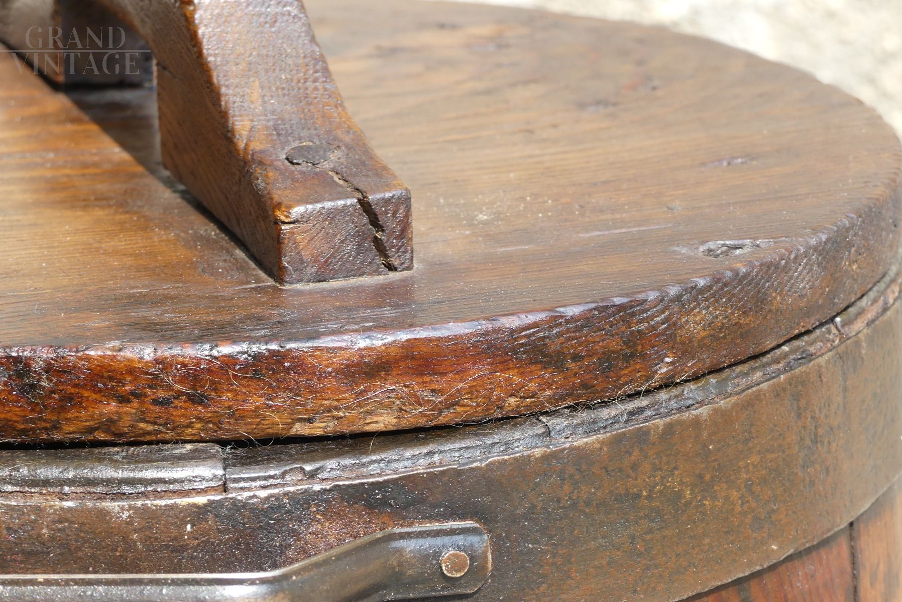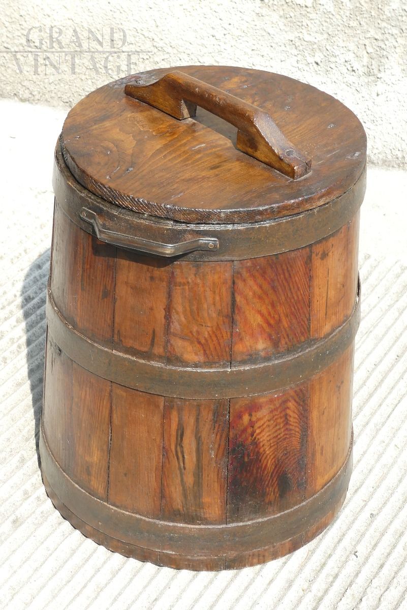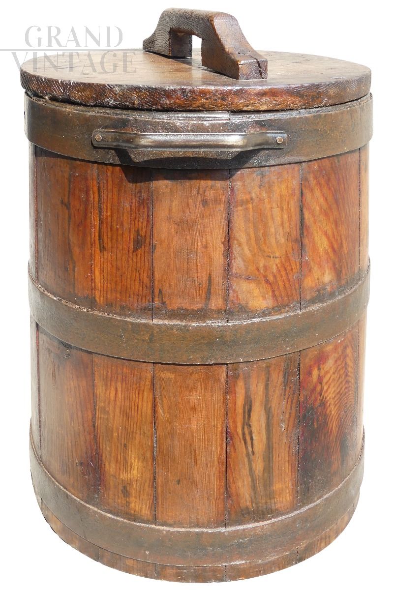 Beautiful ancient vat for flour / milk from the early 1700s. With this precious container, bread was brought to bake in the ovens. It is made from oak and iron and is in excellent condition.