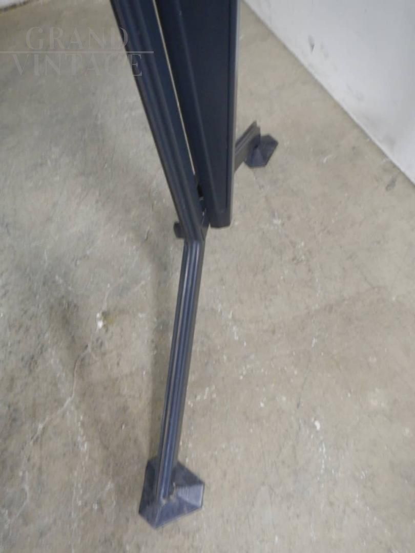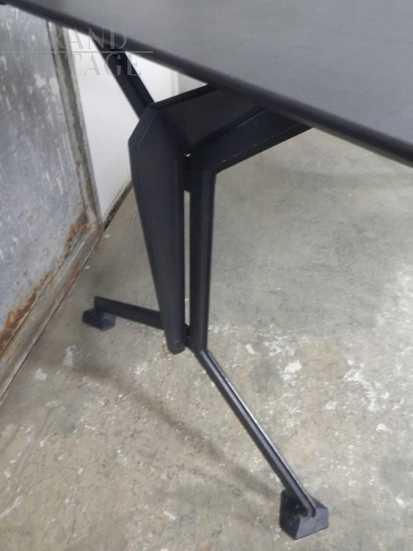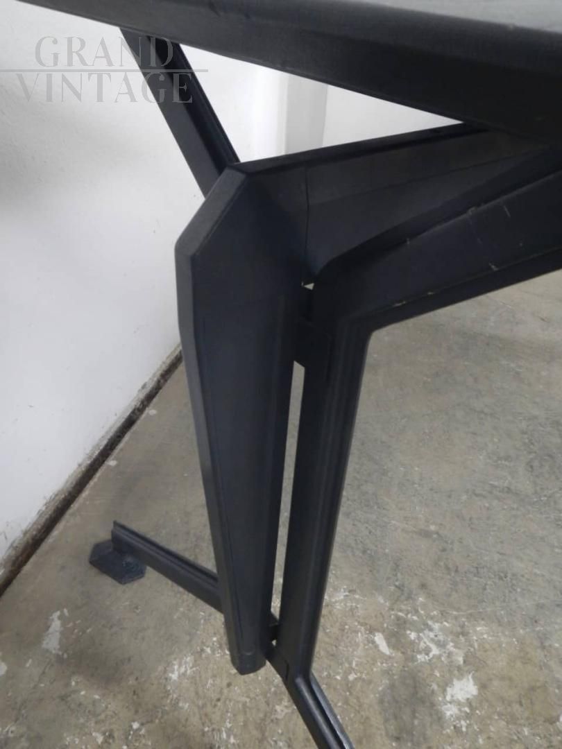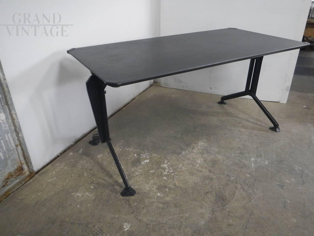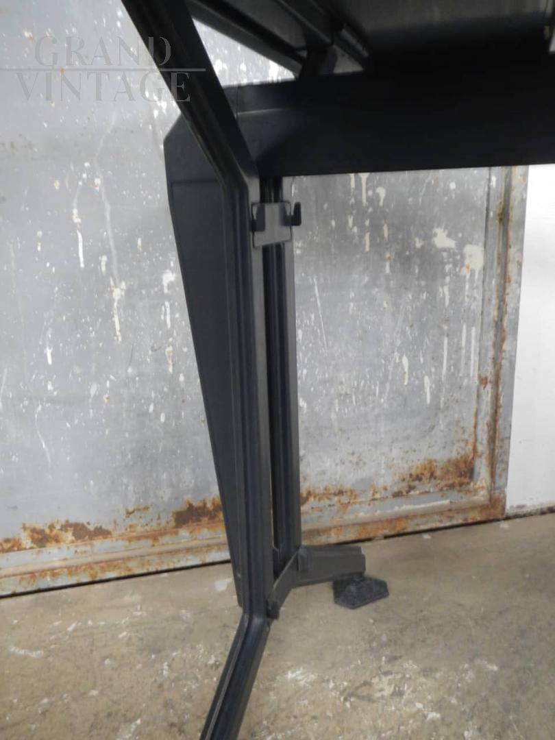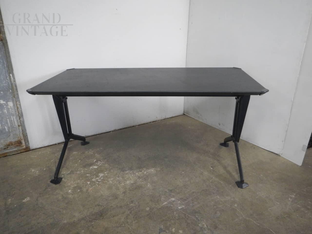 Arco model office table or desk by BBRP for Olivetti Synthesis, with black lacquered iron structure and metal top covered in black skai. The corners of the table are made of plastic and show signs of aging.