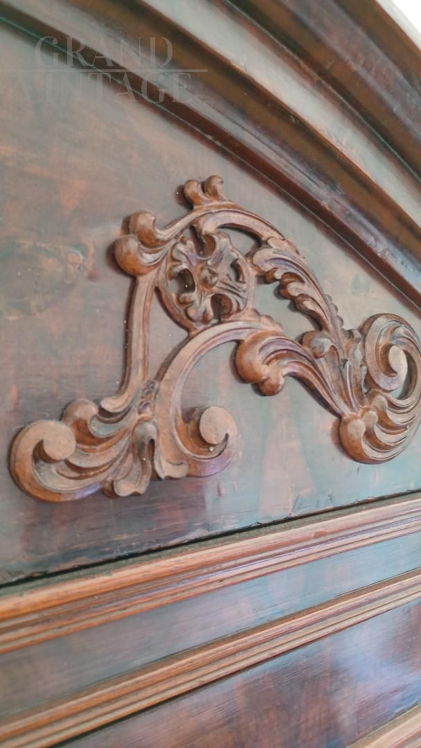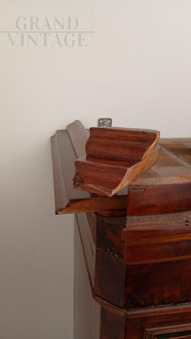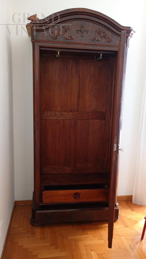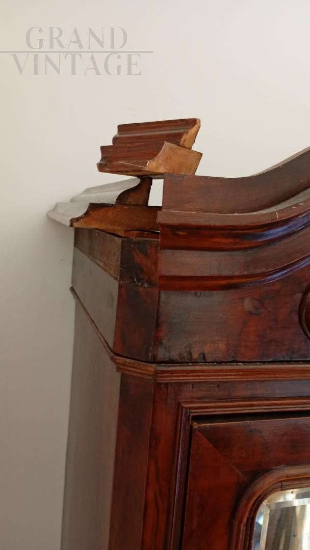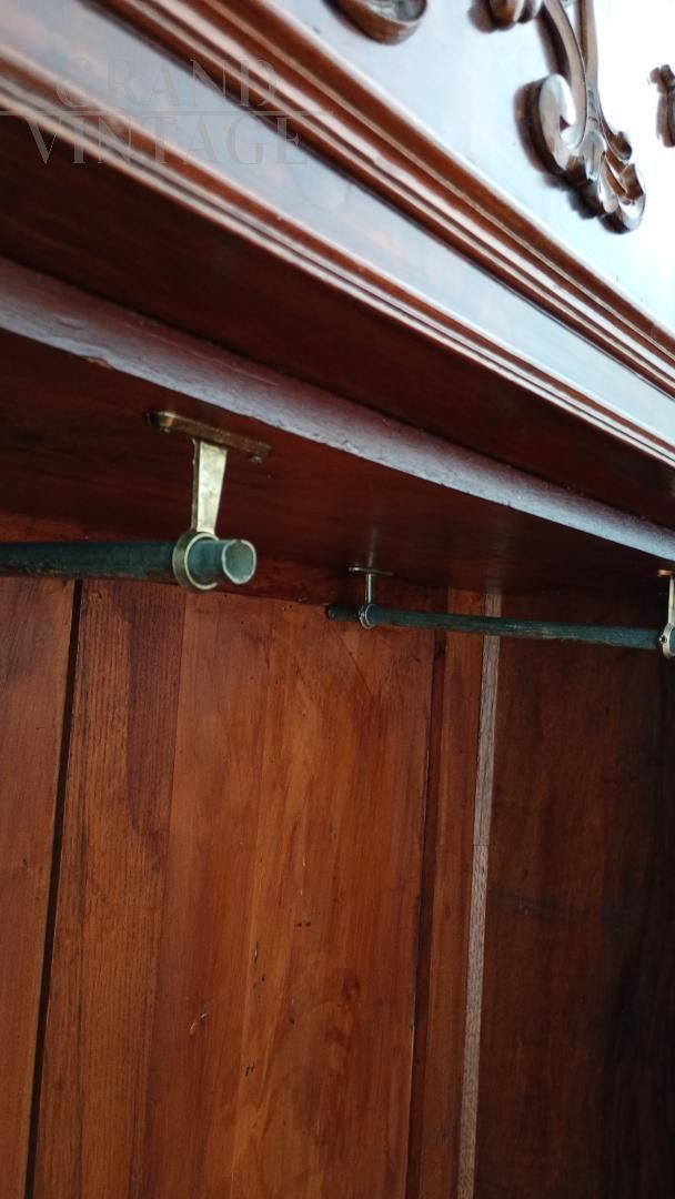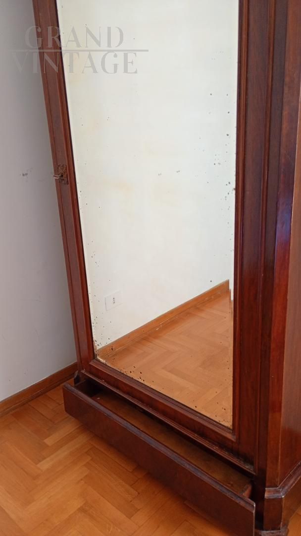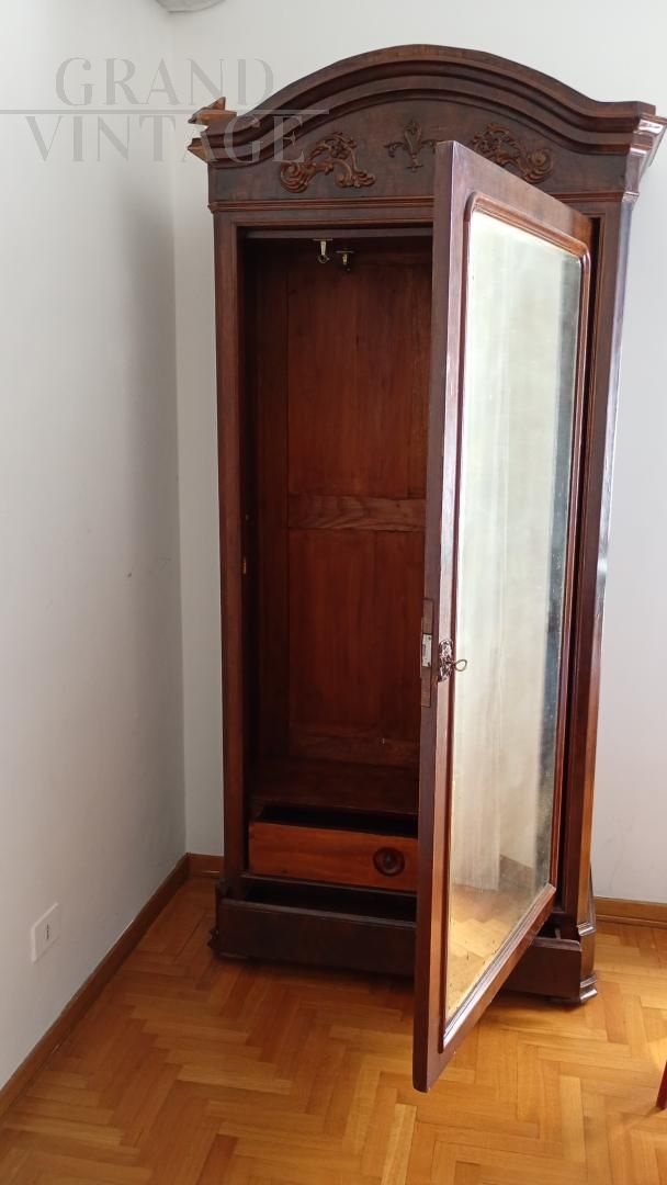 Beautiful wardrobe with mirror complete with a hidden drawer, in the lower part and another with knob in the internal part in addition to the coat hanger. Removable hat with decorations. Due to age and wear, the product requires restoration work and resumption of polishing. Left side of the hat unglued. Anti-woodworm treatment carried out with a natural and patented product. Measurements: Maximum width including hat 107xh227xd47 including hat.