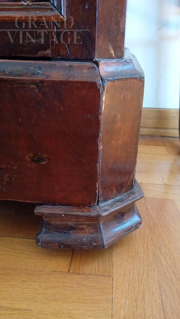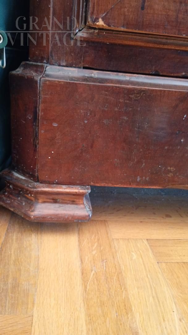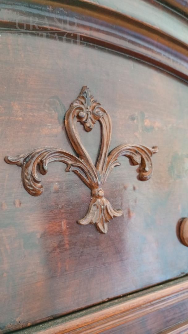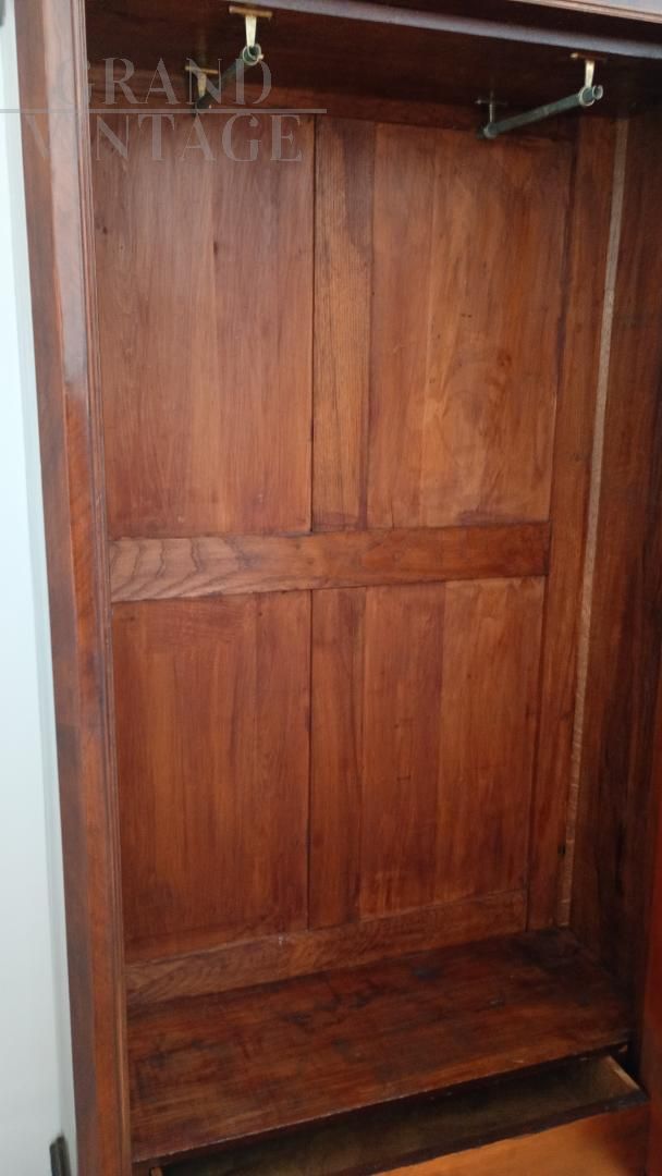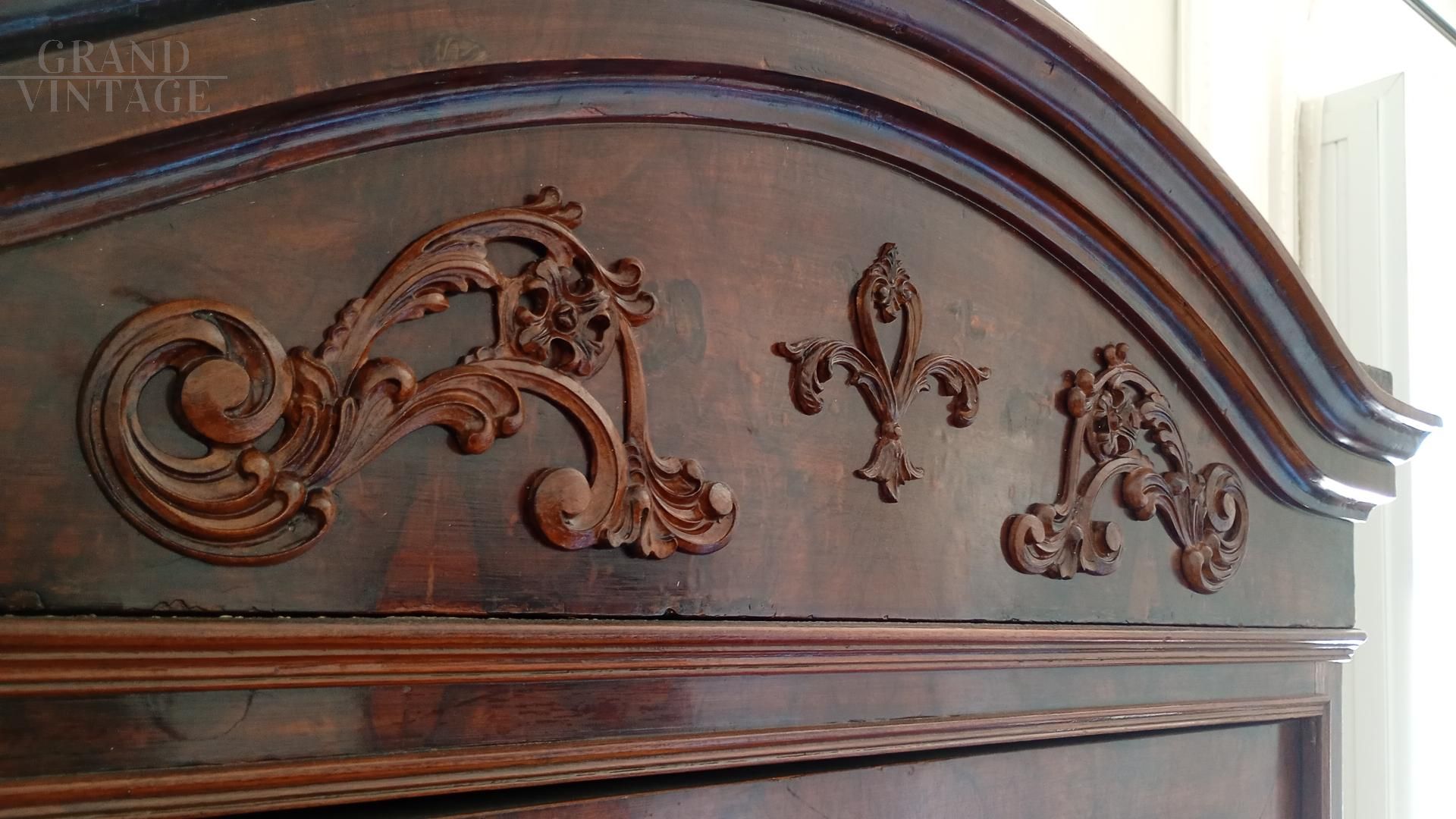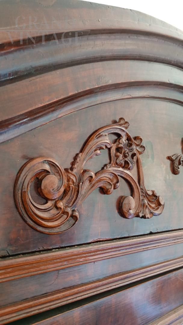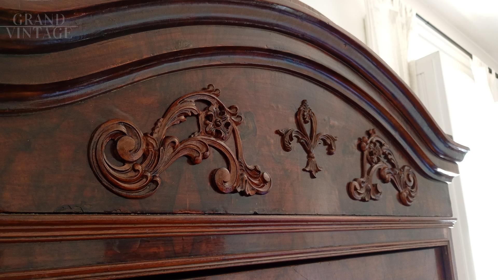 Beautiful wardrobe with mirror complete with a hidden drawer, in the lower part and another with knob in the internal part in addition to the coat hanger. Removable hat with decorations. Due to age and wear, the product requires restoration work and resumption of polishing. Left side of the hat unglued. Anti-woodworm treatment carried out with a natural and patented product. Measurements: Maximum width including hat 107xh227xd47 including hat.