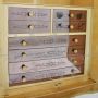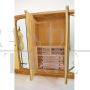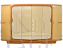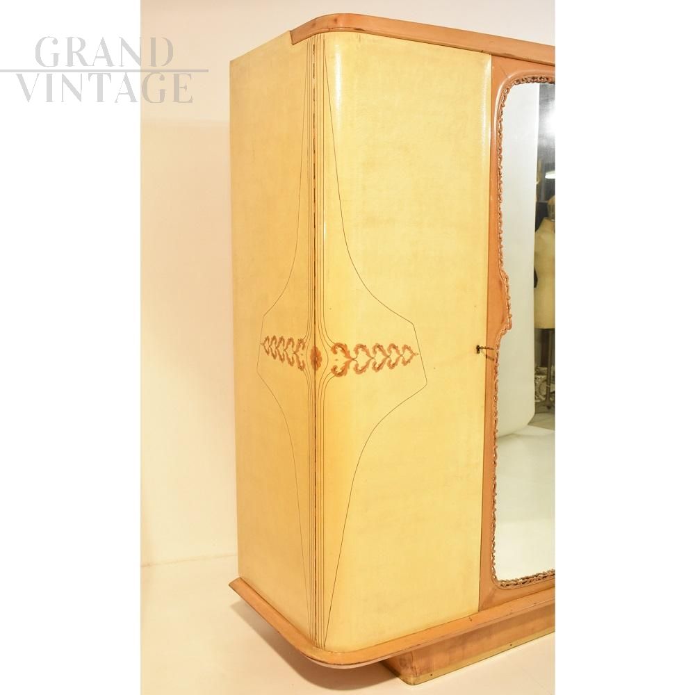 The furniture is externally covered with parchment, the internal part is veneered with light maple or lime wood. The central doors are finished with mirrors and inside, on the ceiling, lighting is provided. In the central part there is a refined chest of drawers covered with decorated mirrors. The wardrobe is in excellent condition, but needs a conservative restoration.