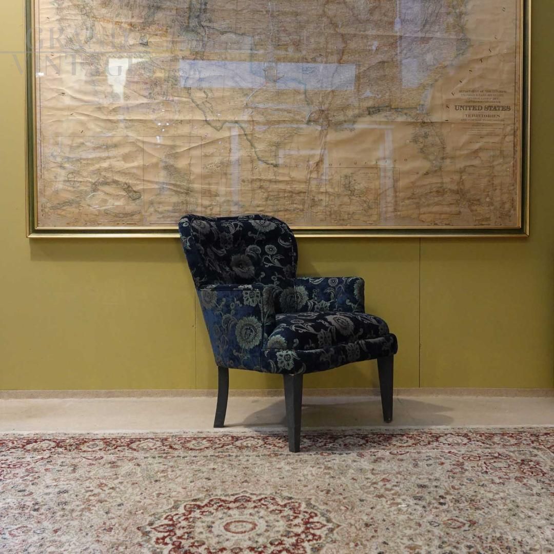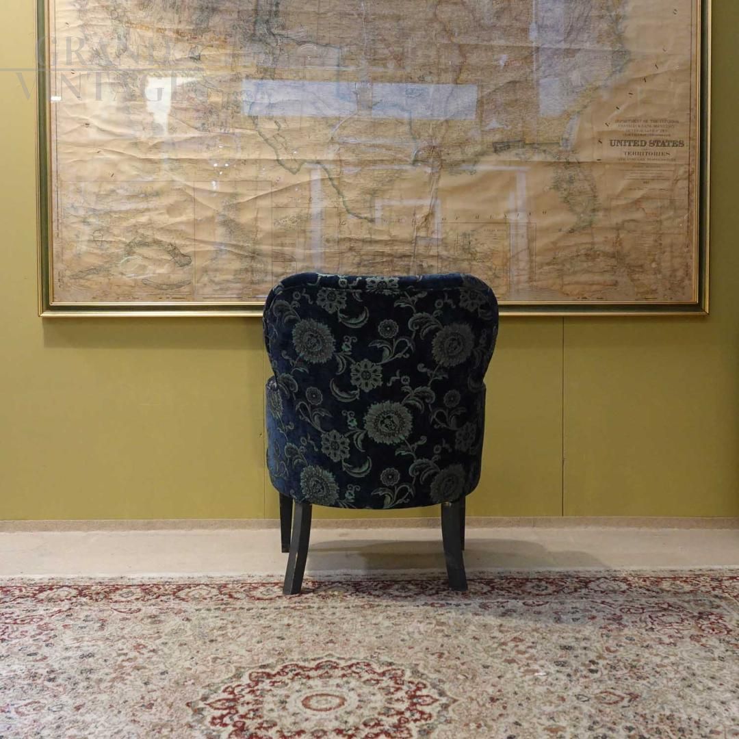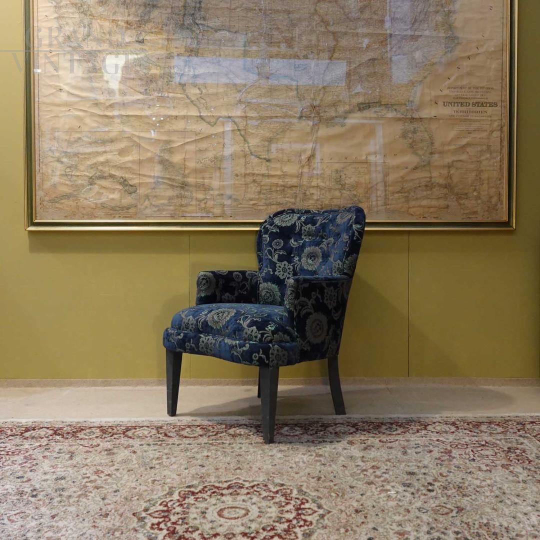 With its blue velvet upholstery decorated with a floral motif, this armchair combines comfort, elegance and personality. A unique piece that gives character and vitality to any environment, perfect for eclectic, creative or bohemian style furnishings.