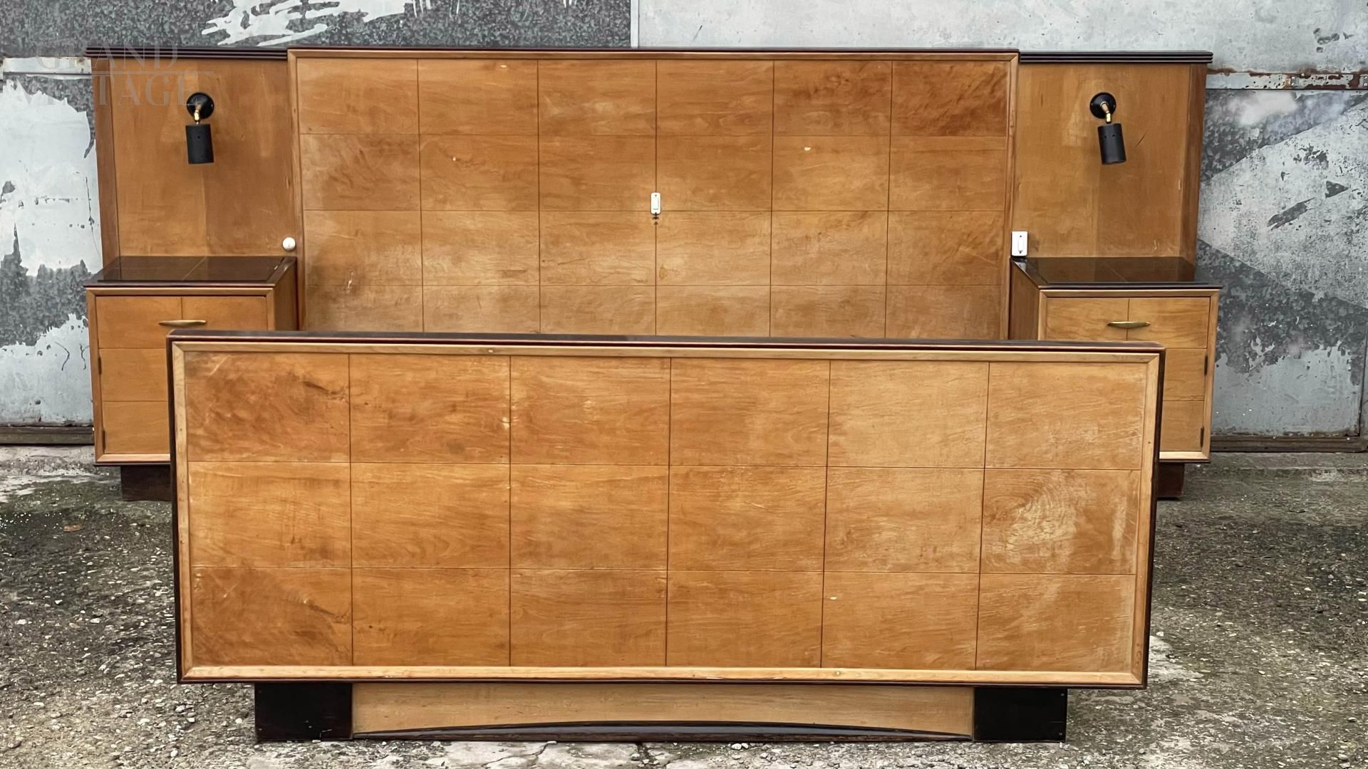 Art deco bed with bedside tables and Stilnovo lamps, 1940s - 1950s