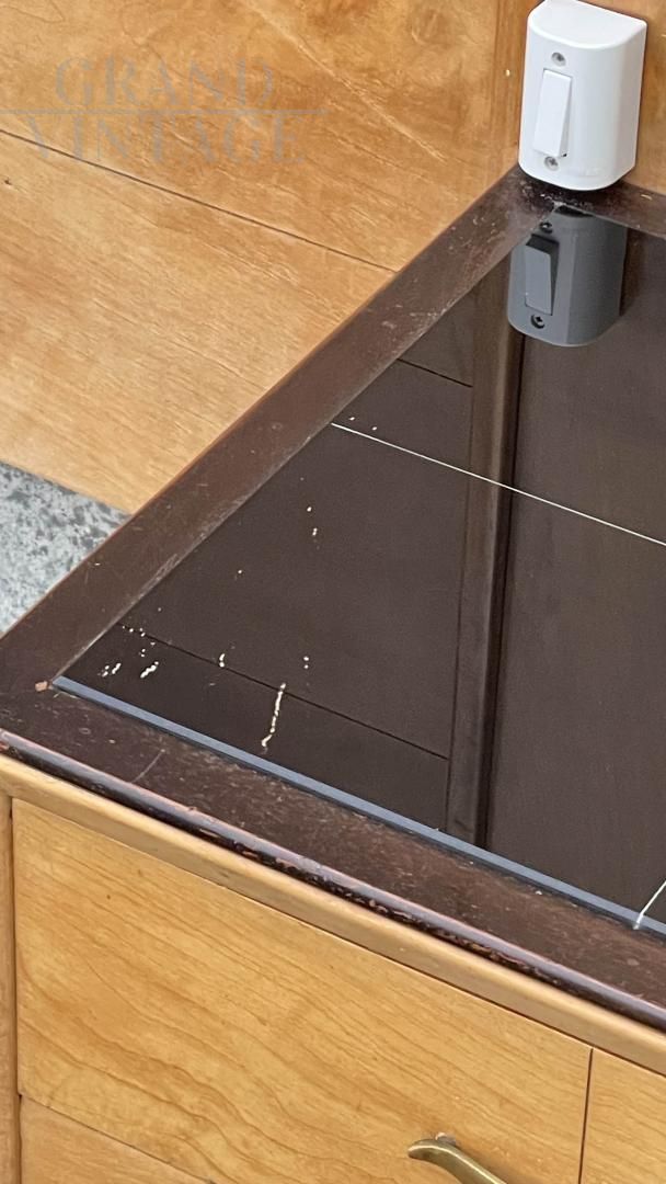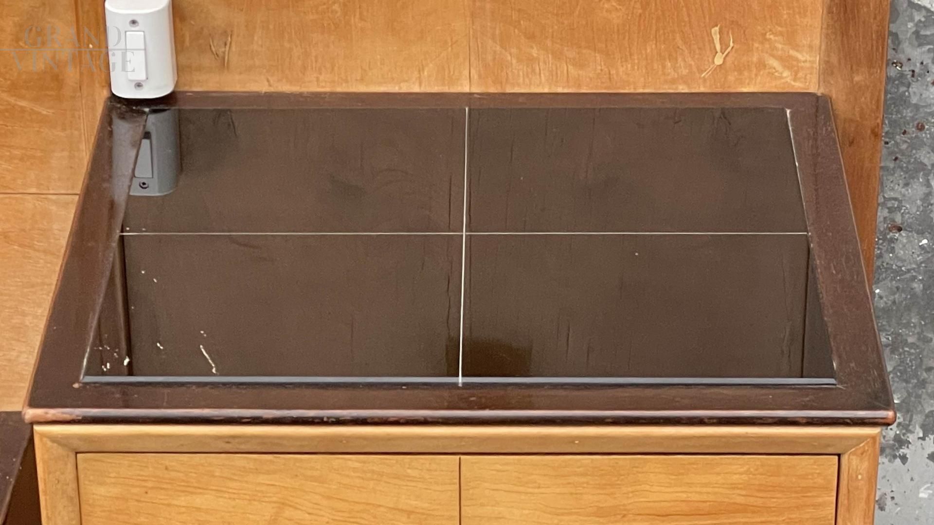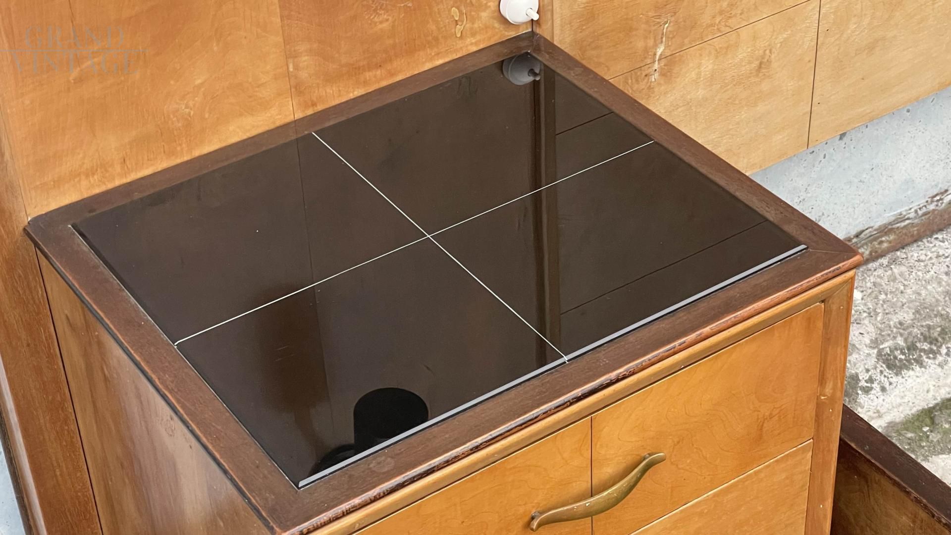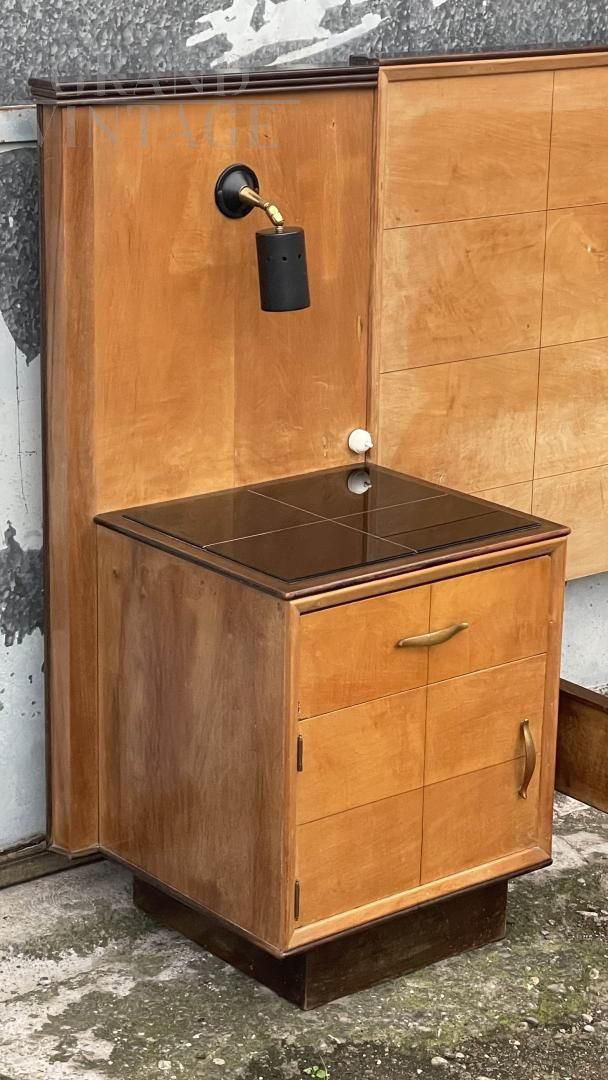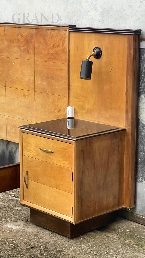 Vintage bed cabinet with built-in bedside tables in ash briar with black glass top and adjustable spotlight appliques attributable to Stilnovo, Italian modern design from the 40s - 50s. The bed is in excellent condition, the bedside tables have a black retro-treated glass top with squares with white edges and a black spotlight wall lamp with a golden adjustable joint, the wall lamps can be attributed to Stilnovo from the 40s/50s. The overall condition is excellent with normal signs of aging which do not ruin the elegance and overall charm. The wall lights are a rare to find Stilnovo model.