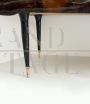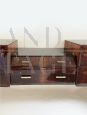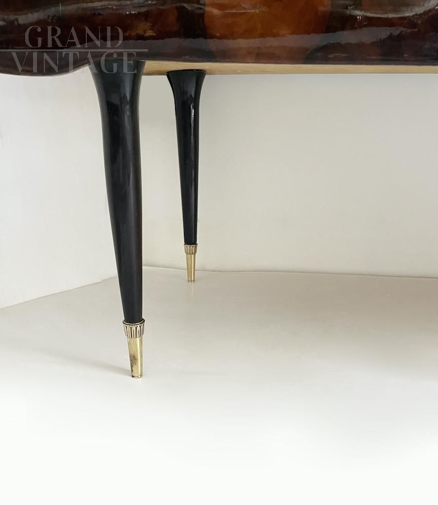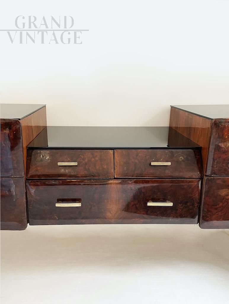 Particular Art Deco buffet cabinet or chest of drawers from the early 1950s. The piece of furniture has a wooden structure, a black colored glass top and brass drawer handles. Featuring 7 drawers, four of which are lateral and four central with different sizes. Elegant legs with brass tips. It has normal and light signs of wear due to age and use.