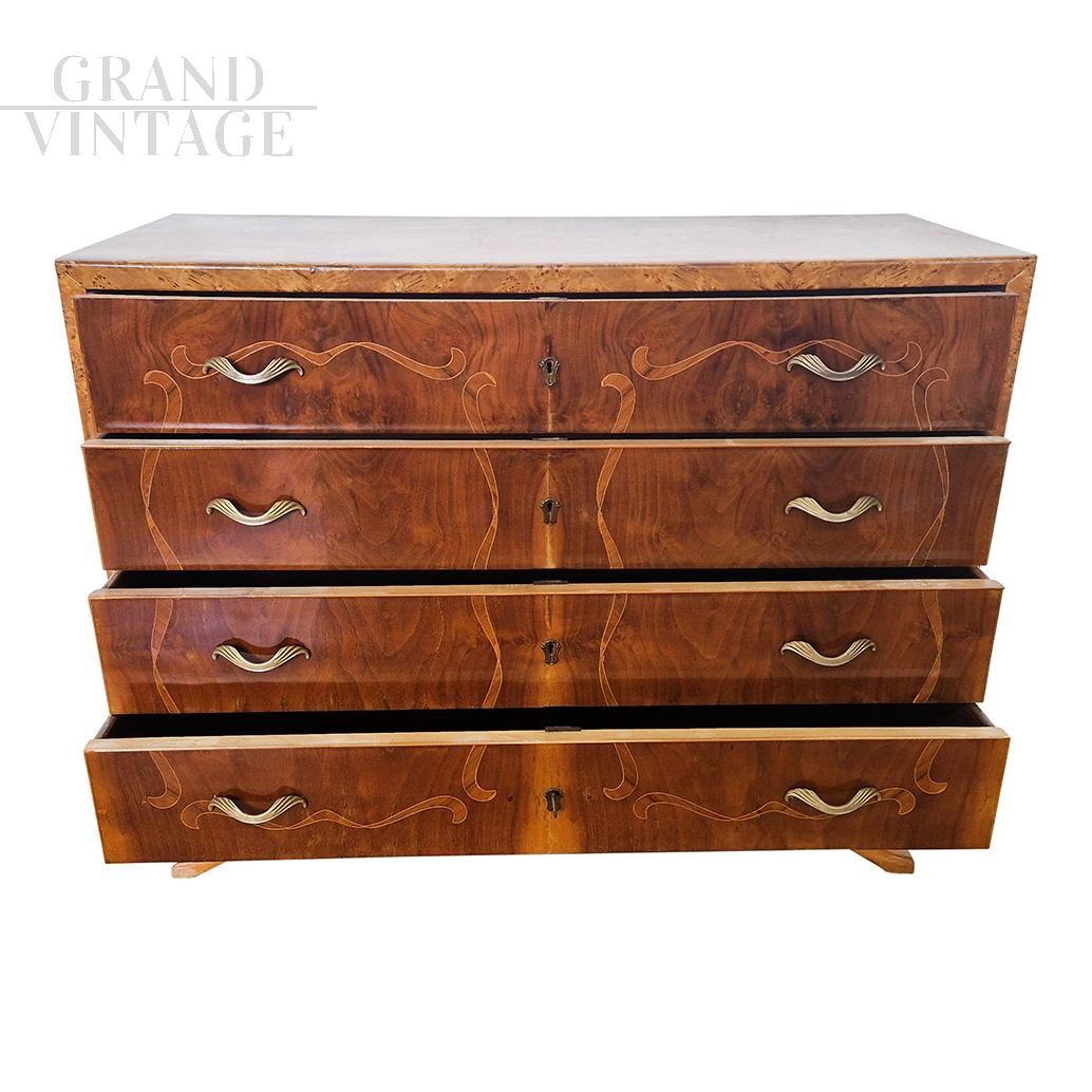 Magnificent art deco dresser in walnut briar with four drawers, with a sinuous line, enriched with maple inlays.