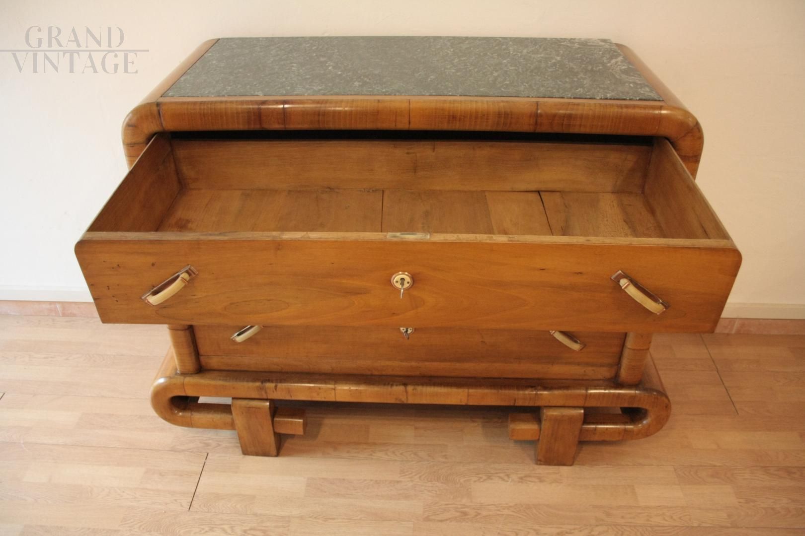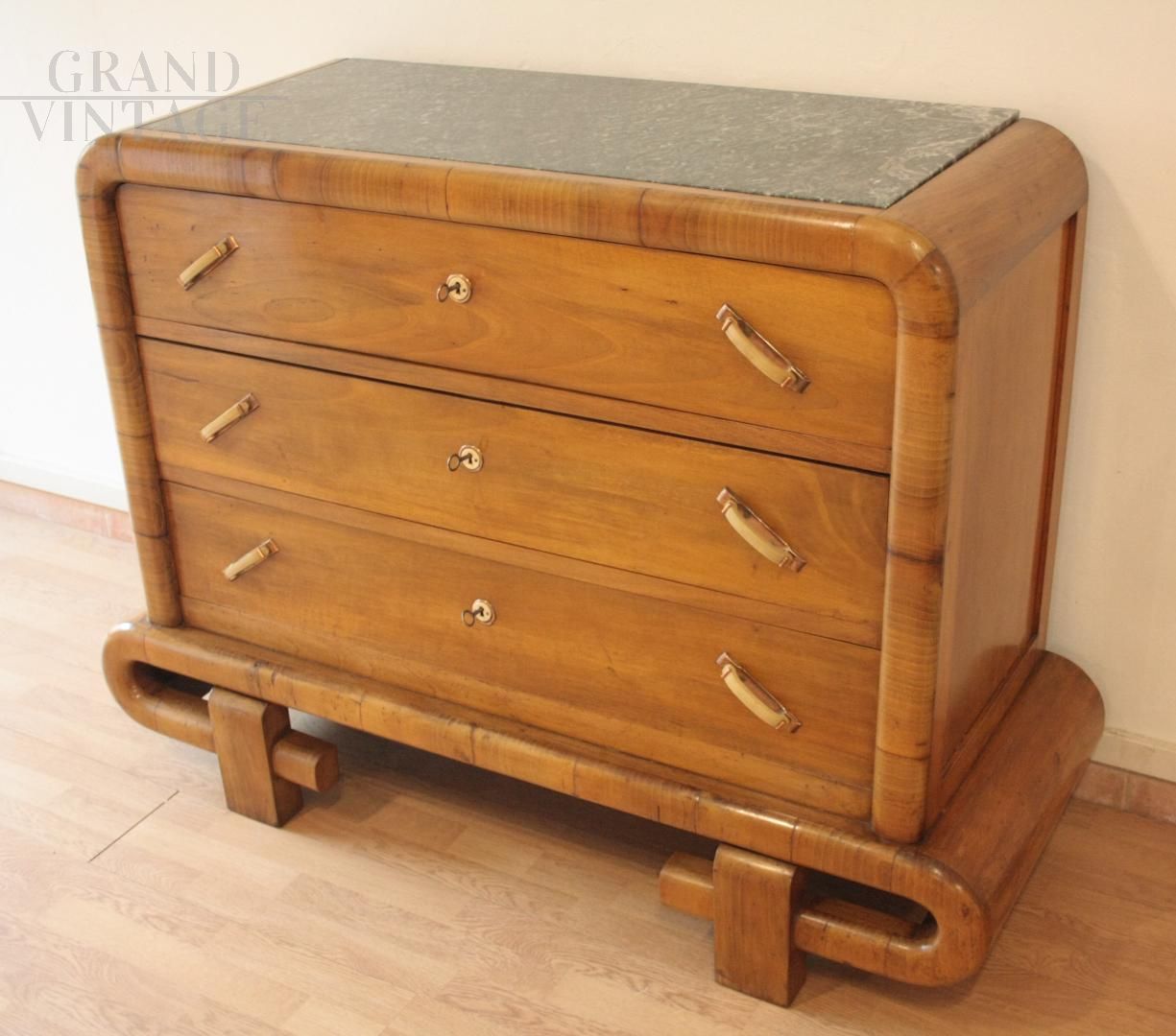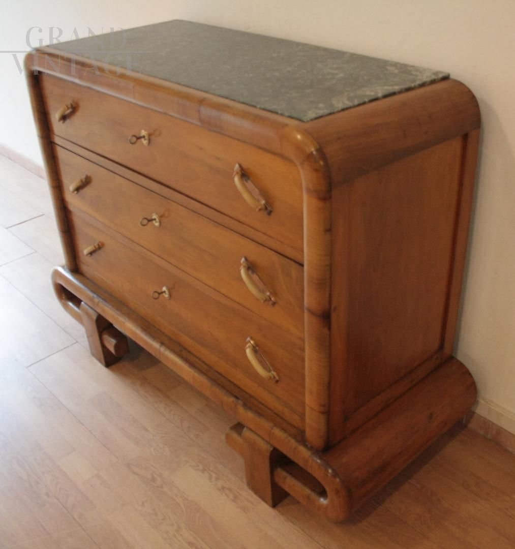 Chest of drawers in solid walnut. Made in the 1950s in Art Deco style, it rightfully falls within Mid Century furniture. Typical line of Deco furniture with a very particular base not frequent of this quality in mid-century furniture. Modern in profile with a marble top in excellent condition of conservation as the rest of the furniture, original in all its parts. Handles also original in brass and fake ivory. The dimensions of the chest of drawers are 137 cm wide by 53 cm deep, for a height of 101 cm. The complete bedroom is available with, in addition to the bedside tables, the chest of drawers, the low dressing table and the secretary.