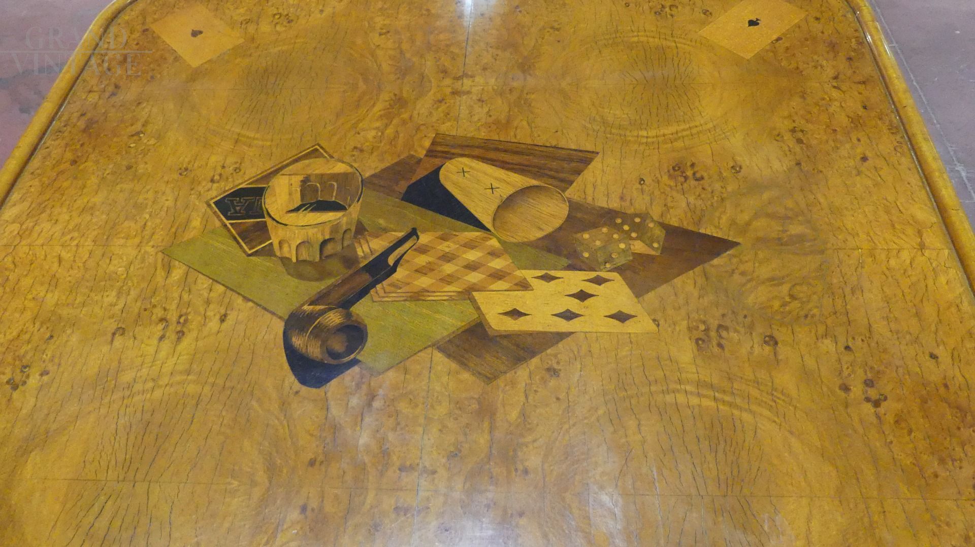 The top, on the other hand, is made of birch wood, finely inlaid with games and vices: a glass, dice, cards, a pipe ... and it can be removed, revealing a beautiful compartment covered with green cloth. On the sides of the table there are 4 drawers.