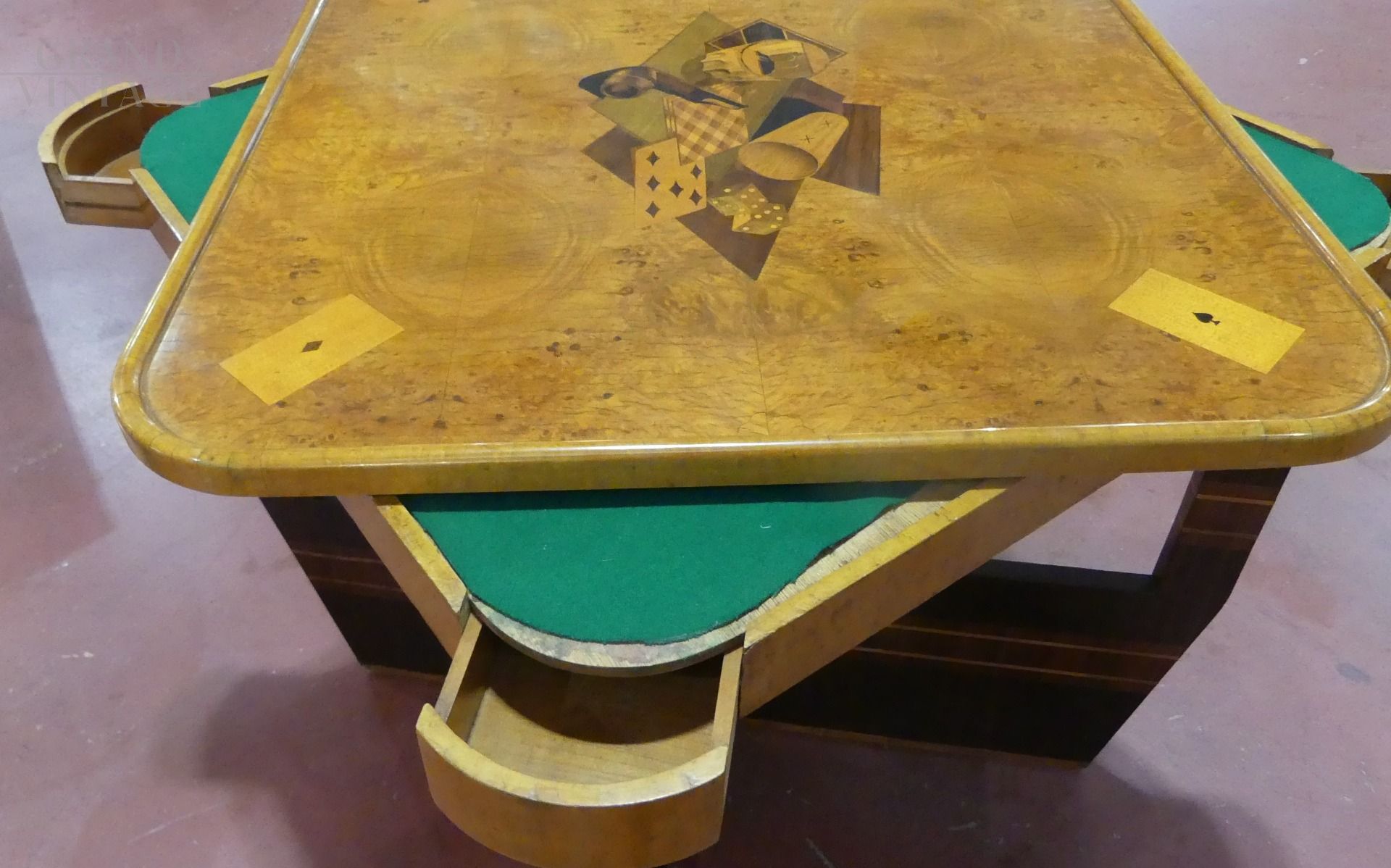 Beautiful Art Deco game table with removable inlaid top and green cloth applied to the lower compartment.