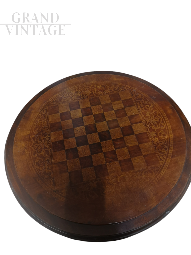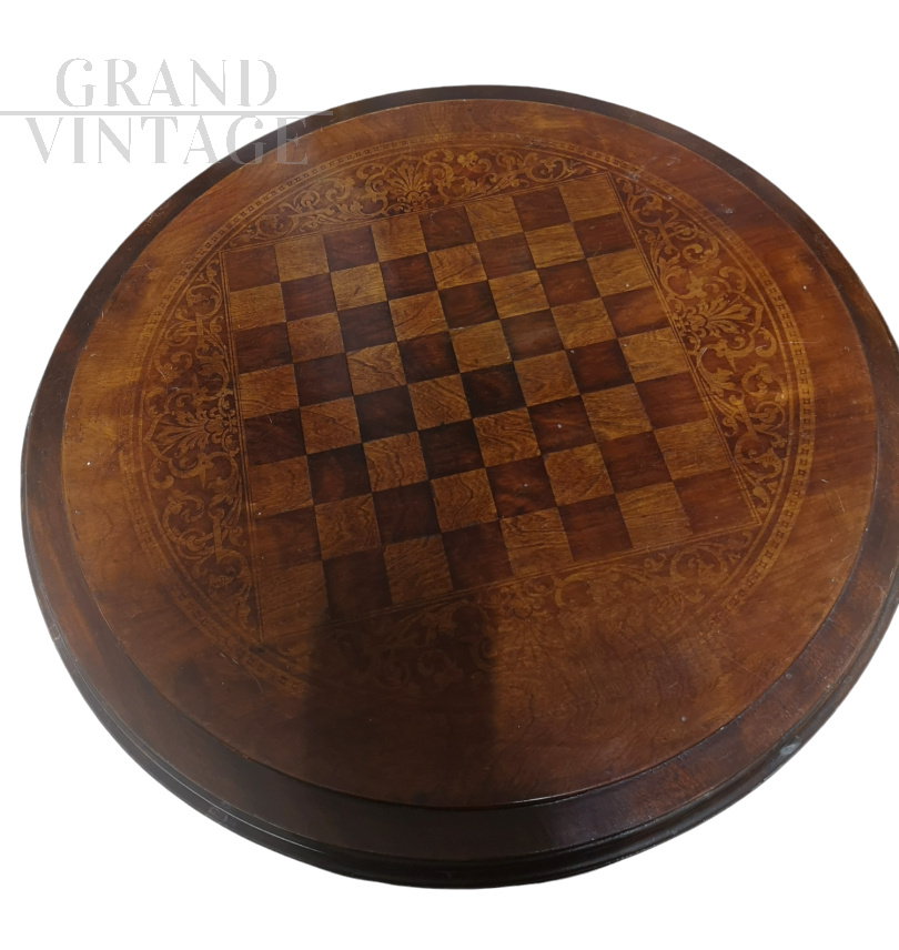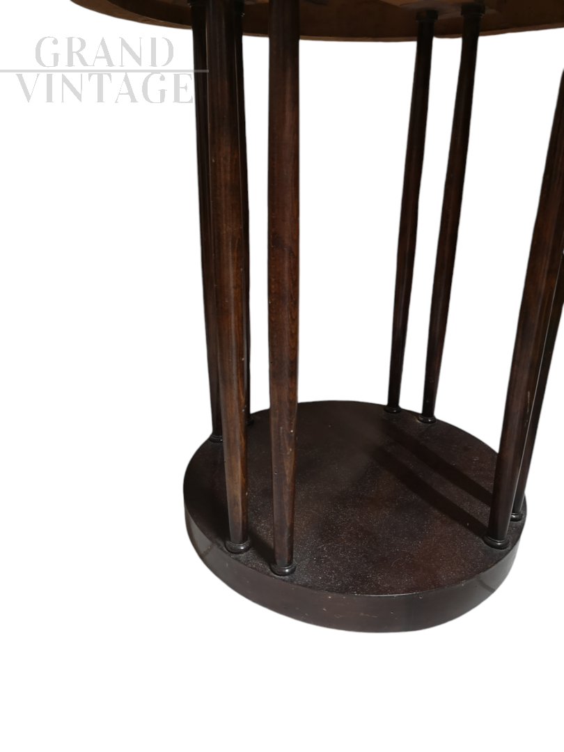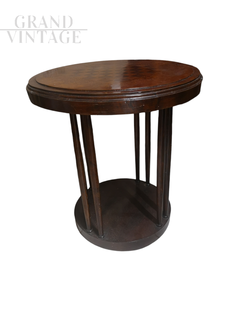 Art Deco Jugendstil round coffee table with checkerboard painted top with floral motifs and column legs, in dark walnut color.