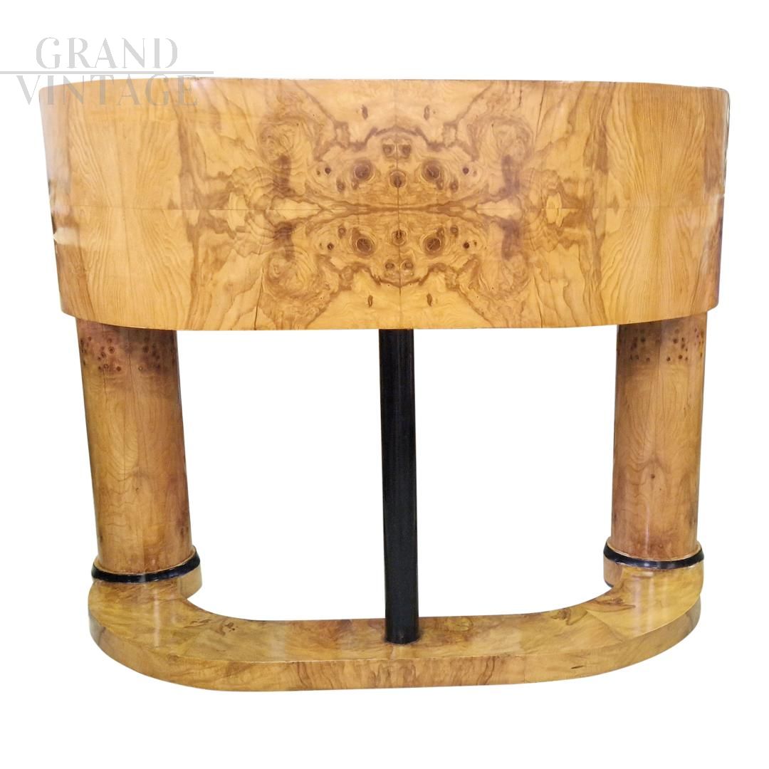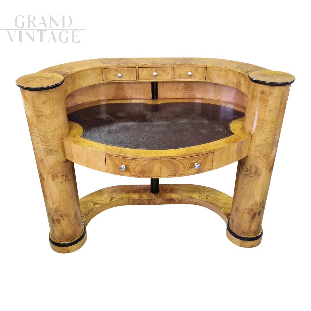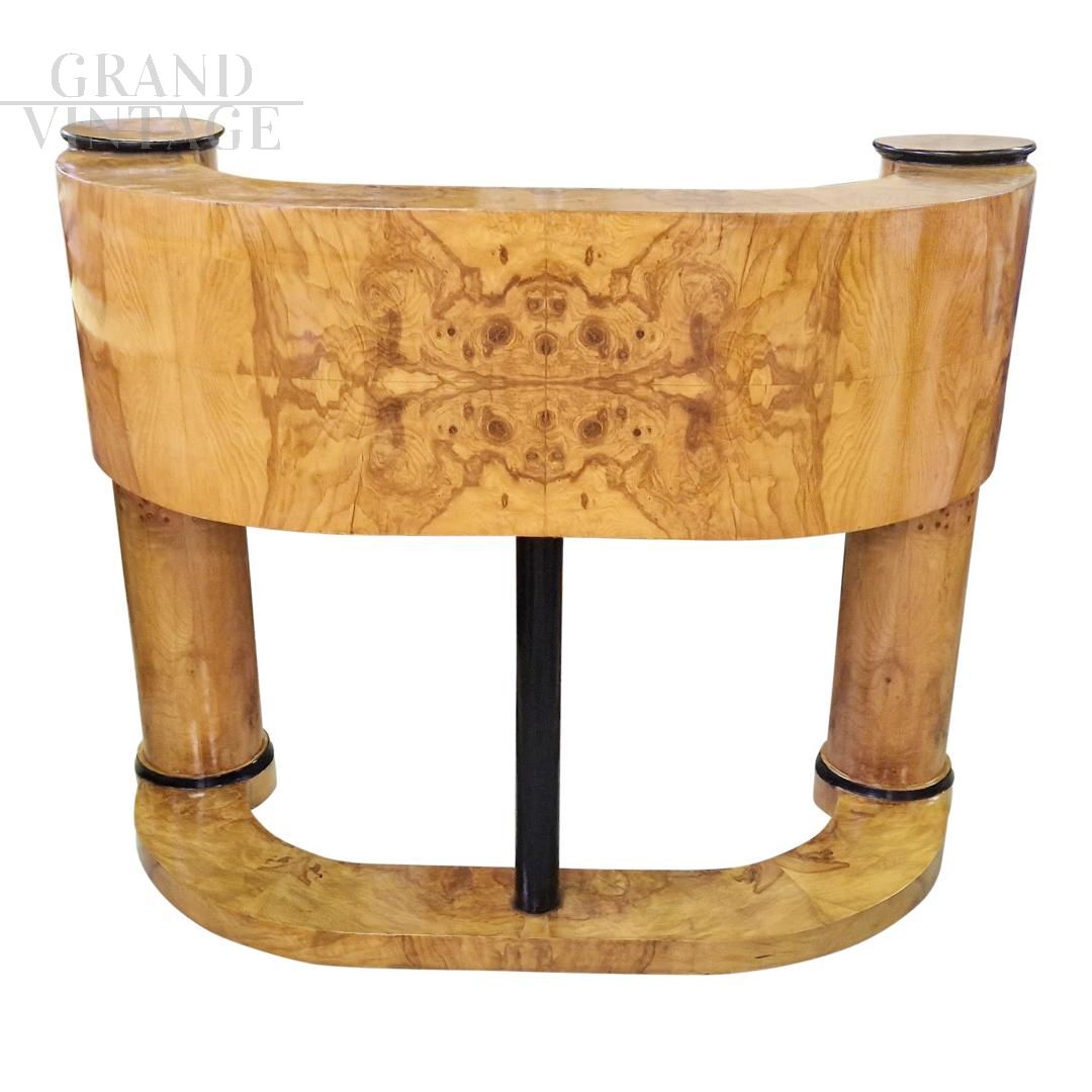 Art Deco style reception desk with birch briar veneered wood structure with black lacquered details. The desk top is covered in eco-leather, the desk is equipped with a large drawer under the worktop and three small drawers on the raised top.