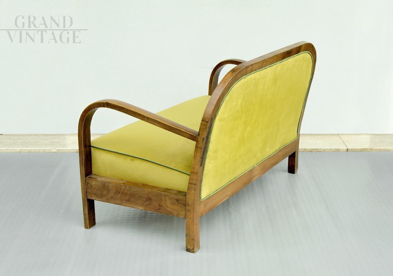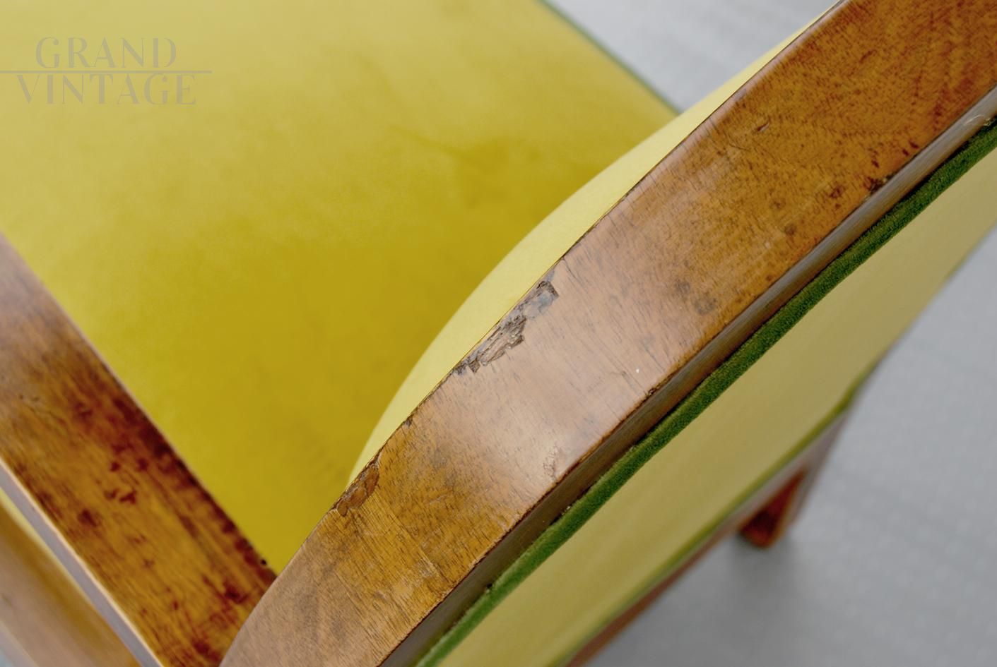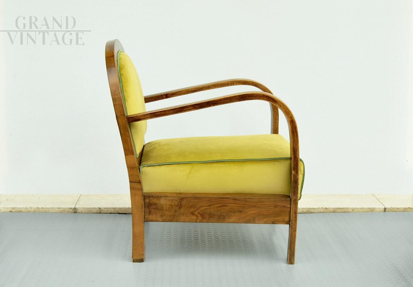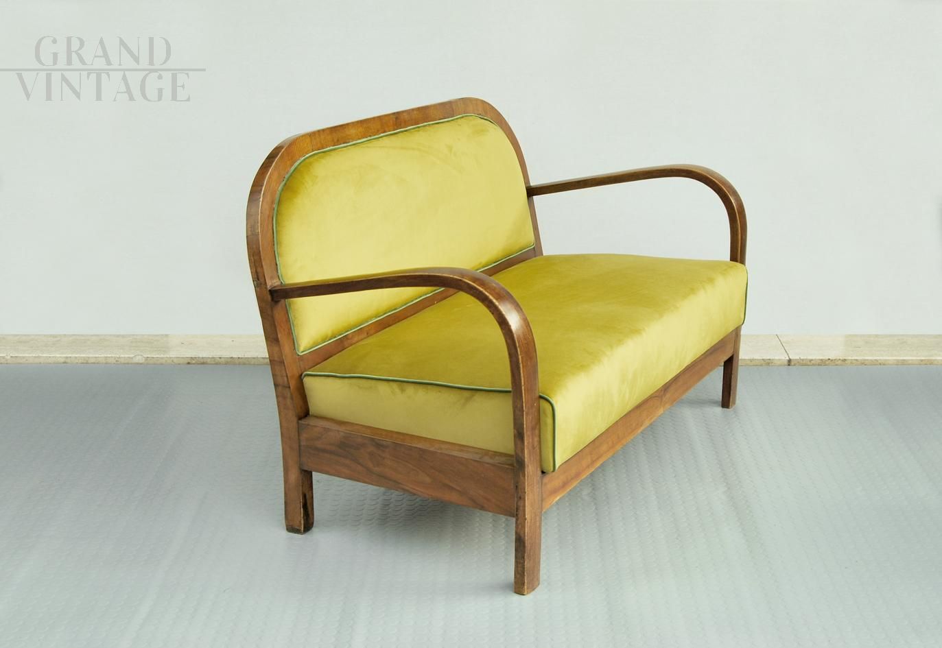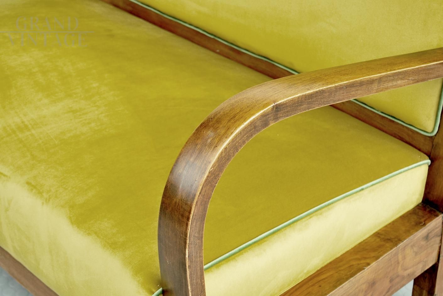 Beautiful vintage Art Deco living room dating back to the 1940s. This Decò lounge is made up of a two-seater sofa and two single armchairs. Built in solid wood and veneered wood, the structure has been restored maintaining its original patina and retains some of the signs of wear caused by time. The padding and upholstery of the seats are new in mustard-coloured velvet with green edges. Vintage set in excellent condition.