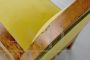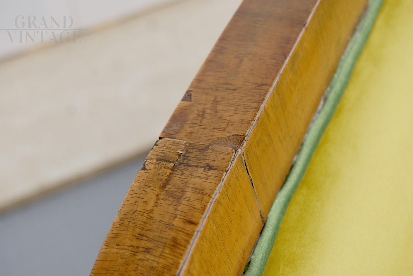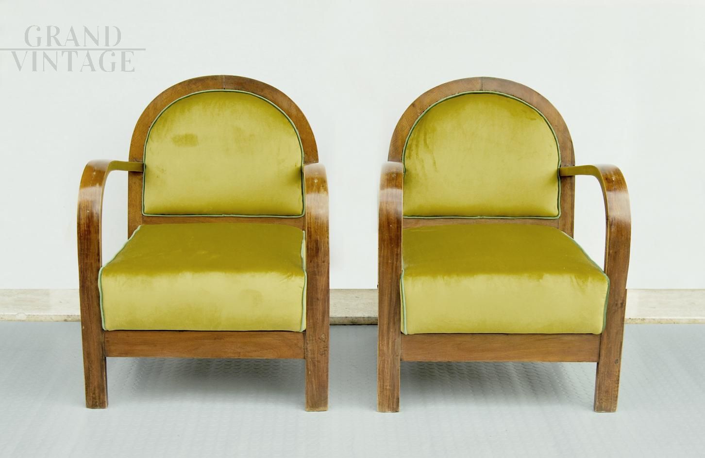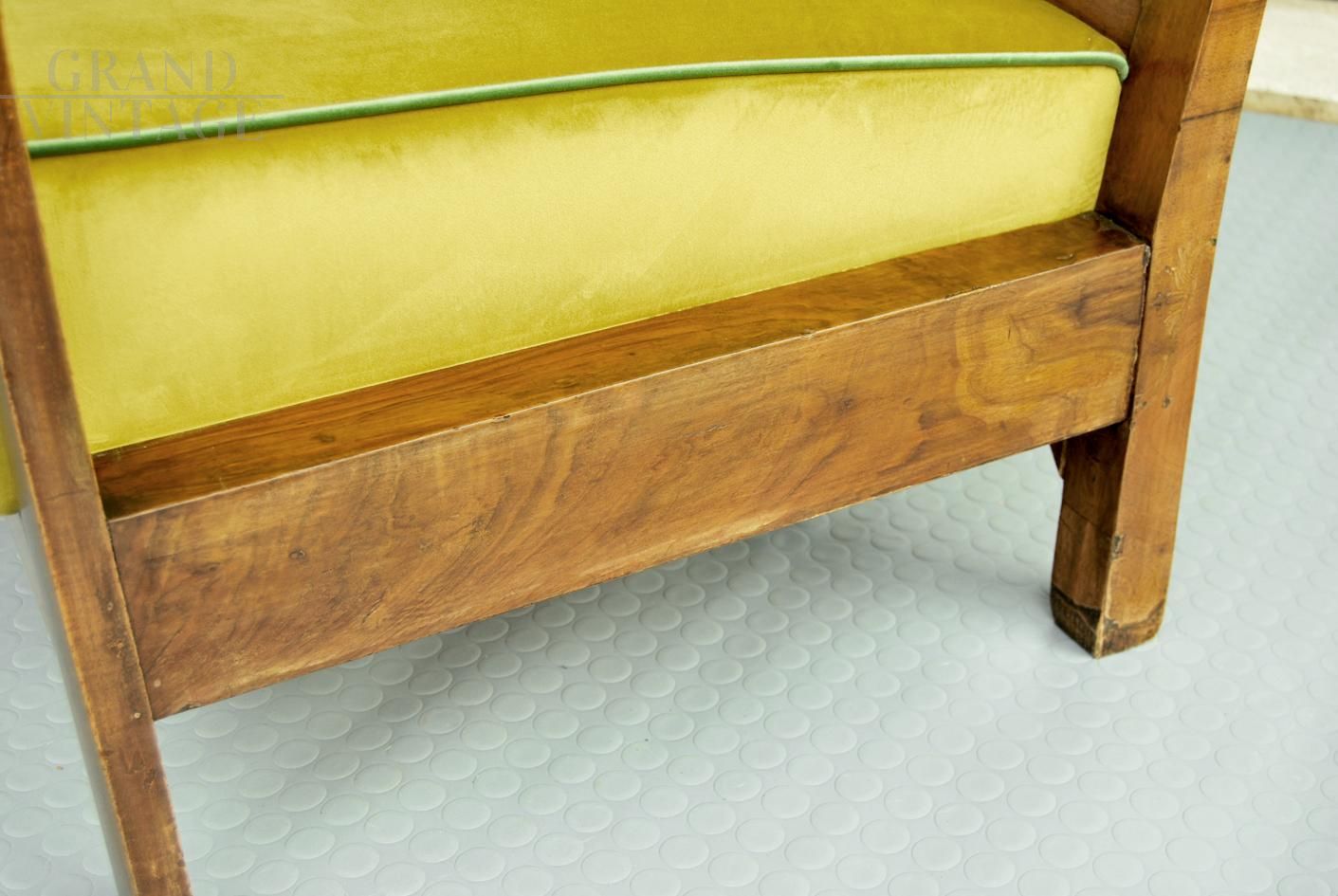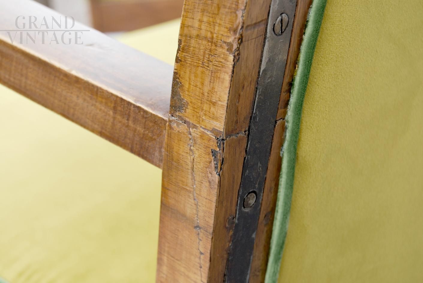 Beautiful vintage Art Deco living room dating back to the 1940s. This Decò lounge is made up of a two-seater sofa and two single armchairs. Built in solid wood and veneered wood, the structure has been restored maintaining its original patina and retains some of the signs of wear caused by time. The padding and upholstery of the seats are new in mustard-coloured velvet with green edges. Vintage set in excellent condition.