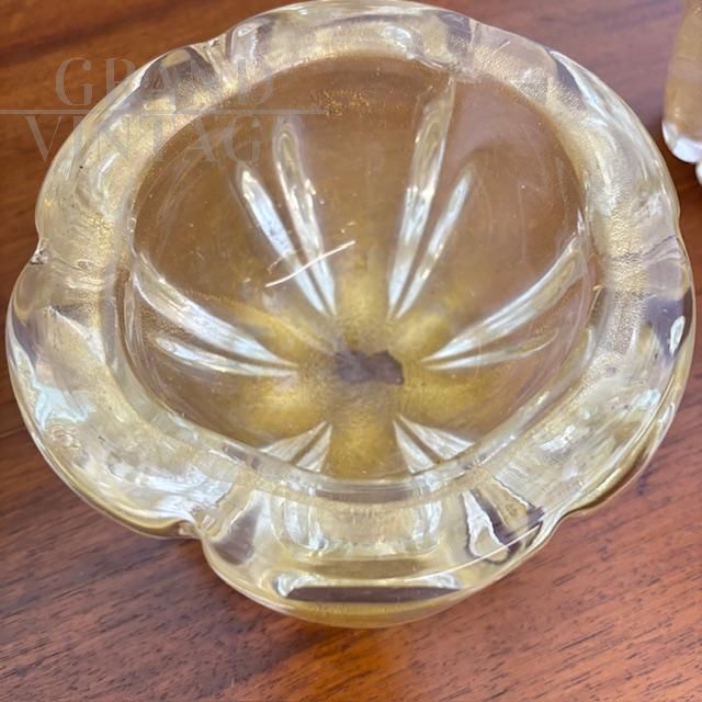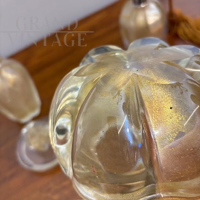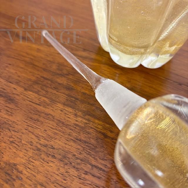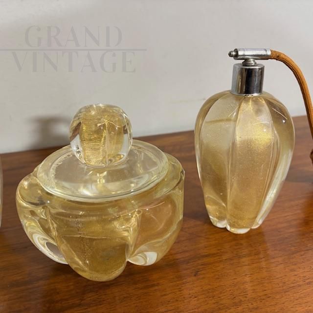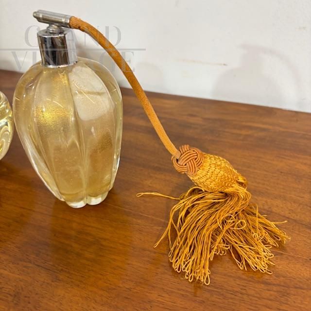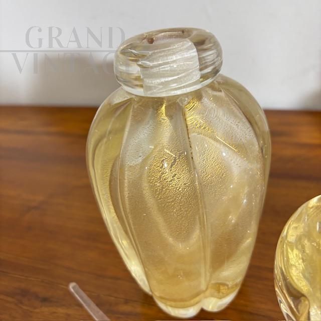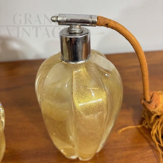 Vintage art deco perfume set consisting of three bottles with related stoppers in artistic Murano glass with gold dust, 1940s, in very good condition.