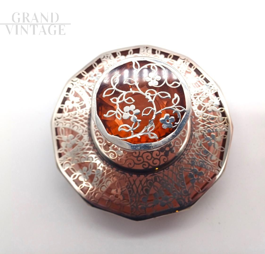 Refined Art Deco-style toiletry set from the 1920s, consisting of three pieces in amber/salmon-colored blown glass with elaborate floral and geometric decorations made with silver foil. The set includes: