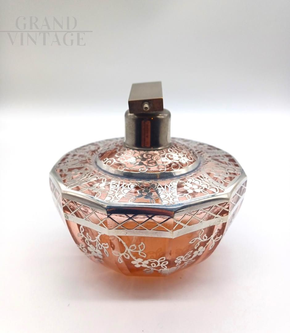 Art Deco pink blown glass toilet set with silver leaf decorations, 1920s