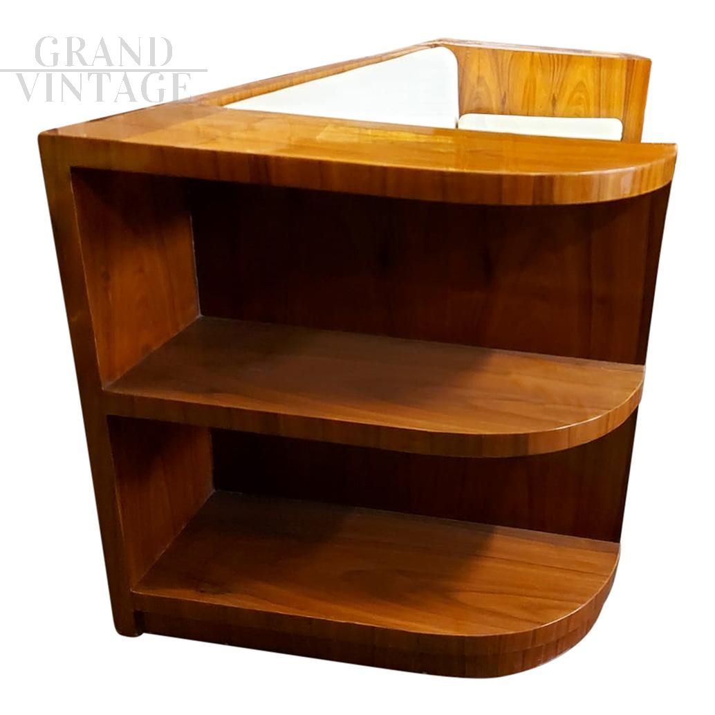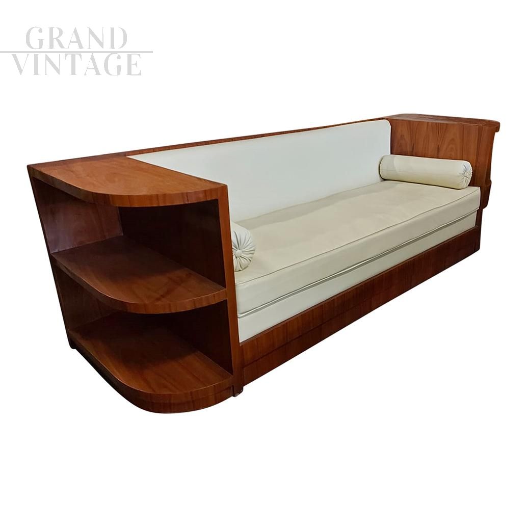 Art Deco style sofa in beech wood veneered in rosewood, padded and covered in white eco-leather, complete with open shelves with rounded corners on both the right and left. The white eco-leather upholstery is in excellent condition, as are the two supplied headrest cushions.