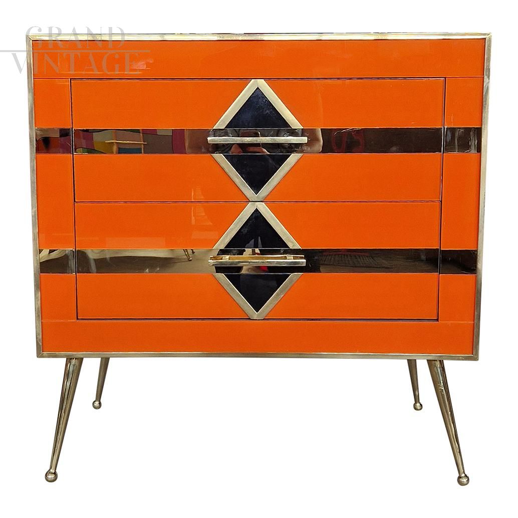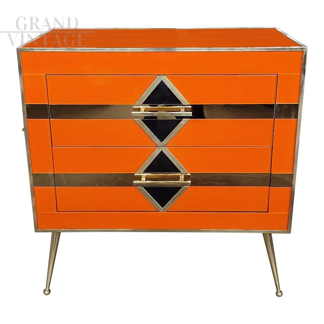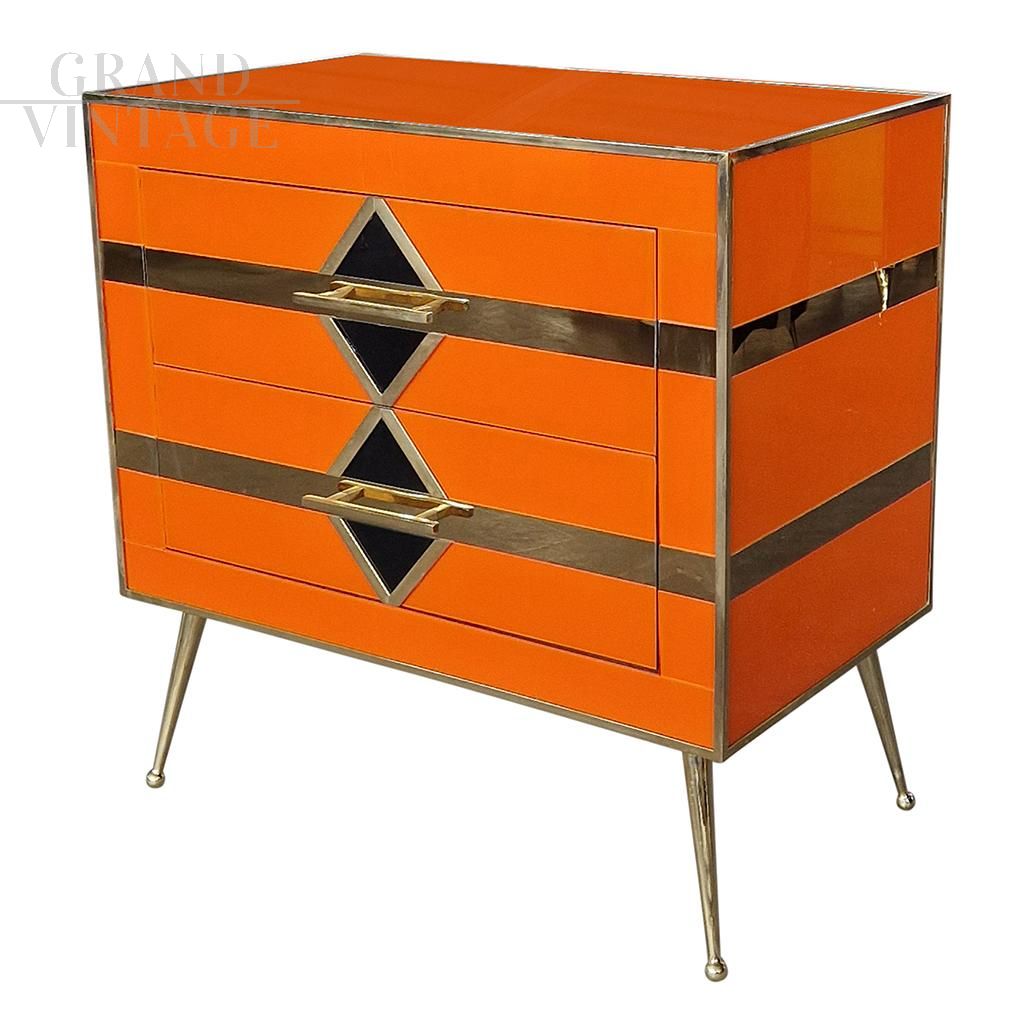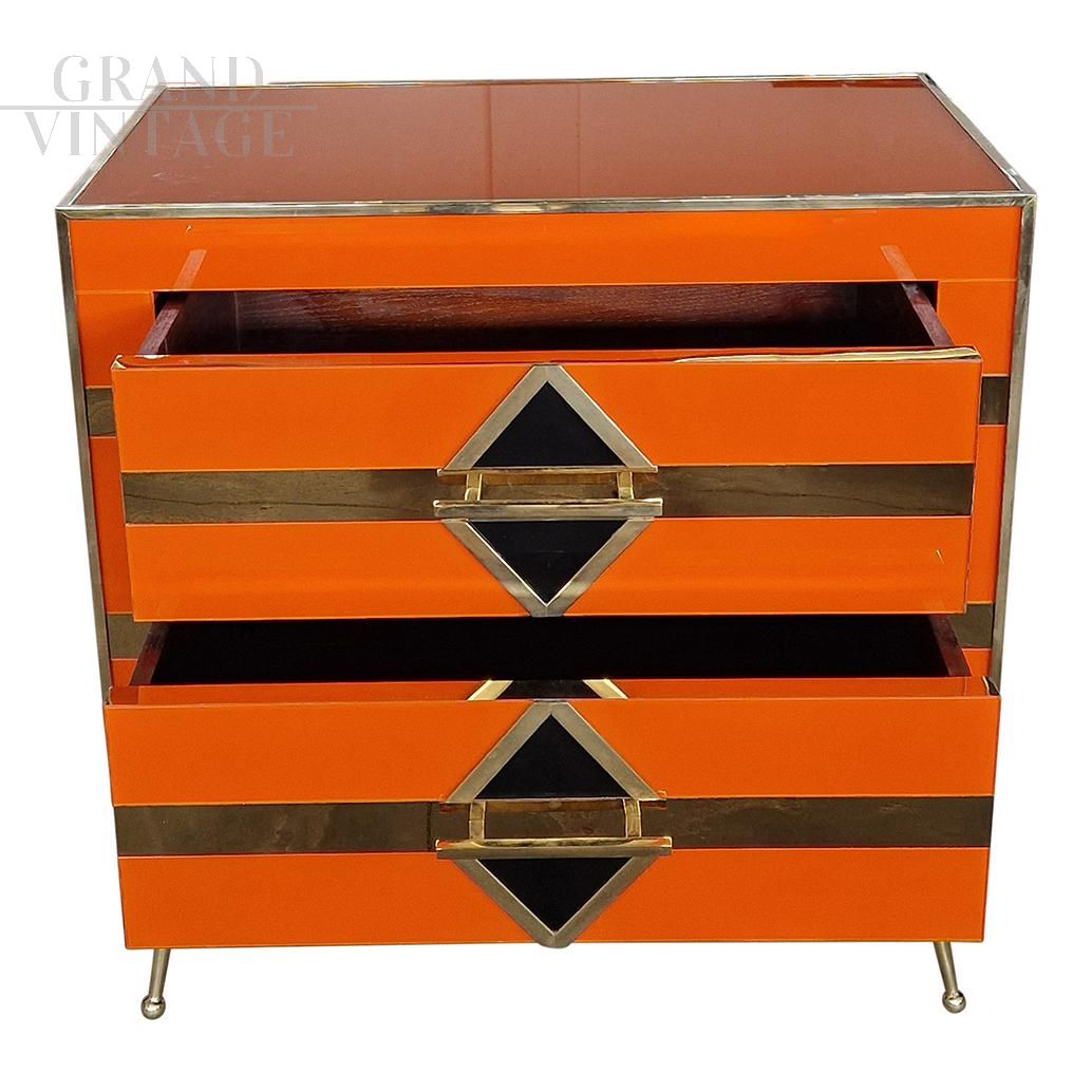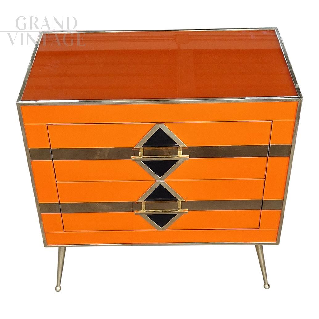 Bedside cabinet with two drawers in art deco style entirely handmade, with wooden structure covered in orange glass with geometries of black glass rhombuses and mirrored golden lines, handle profiles and feet in golden brass.