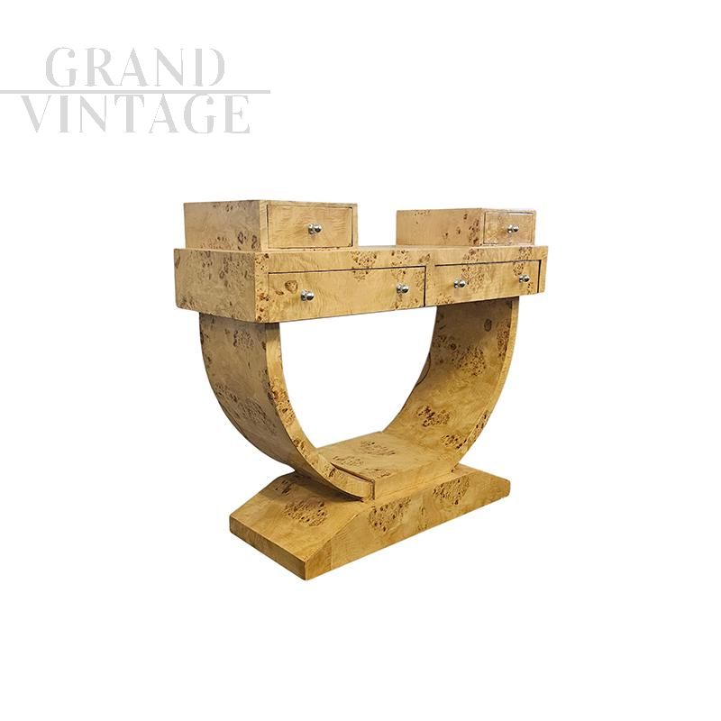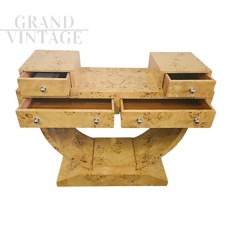 Art Deco-style birch briar console table with a cup-shaped shape and four drawers.