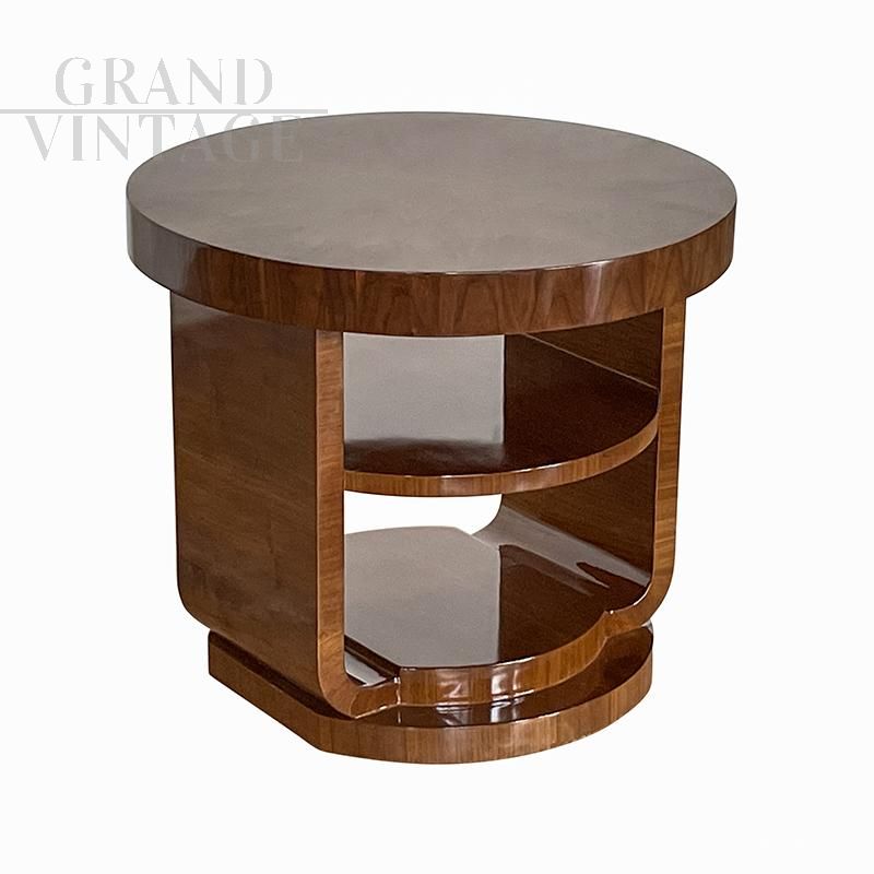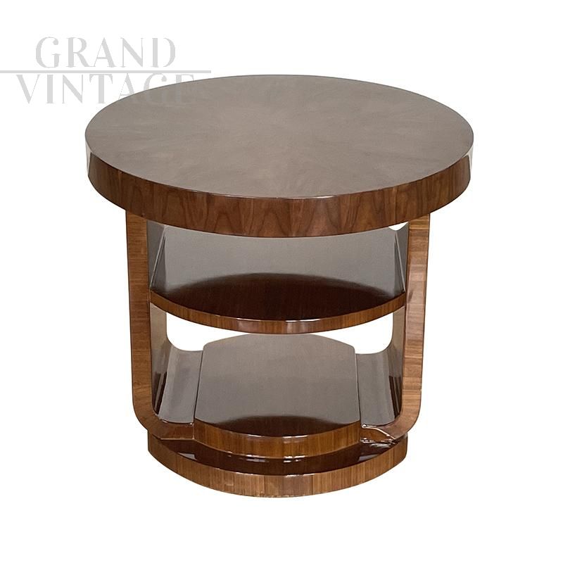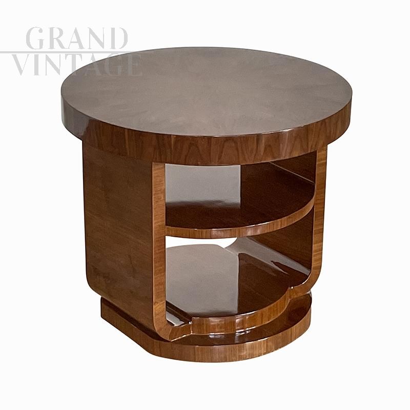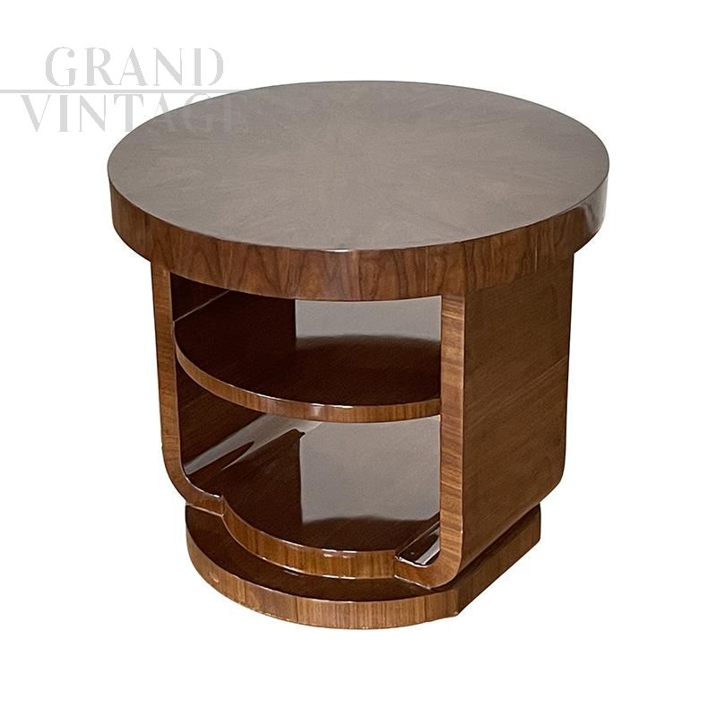 Round art deco style coffee table in walnut briar with double top.