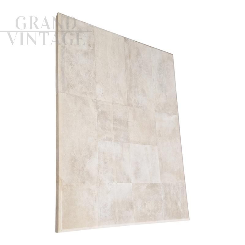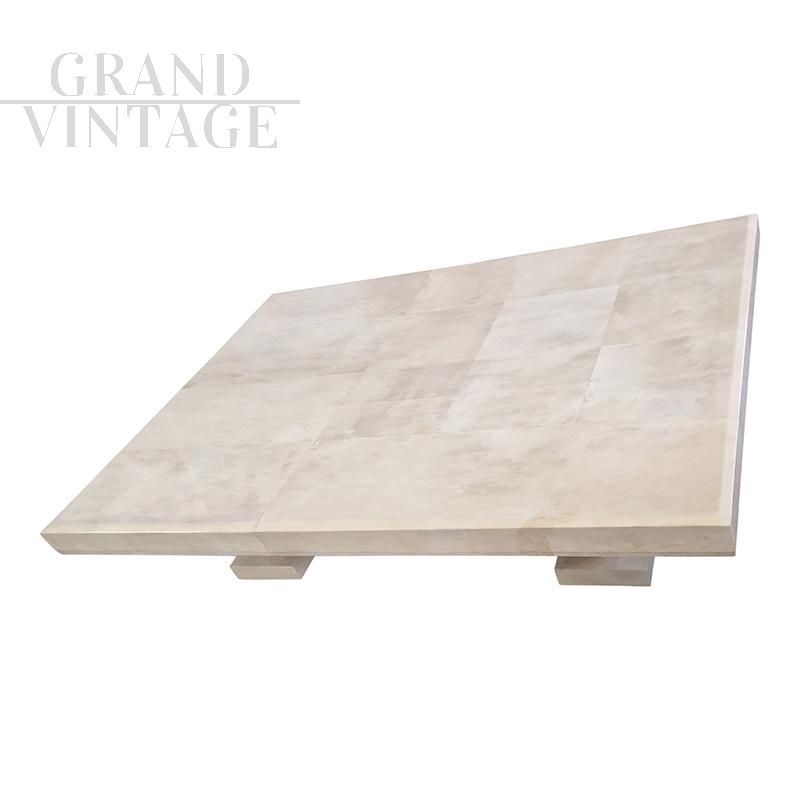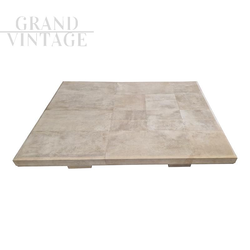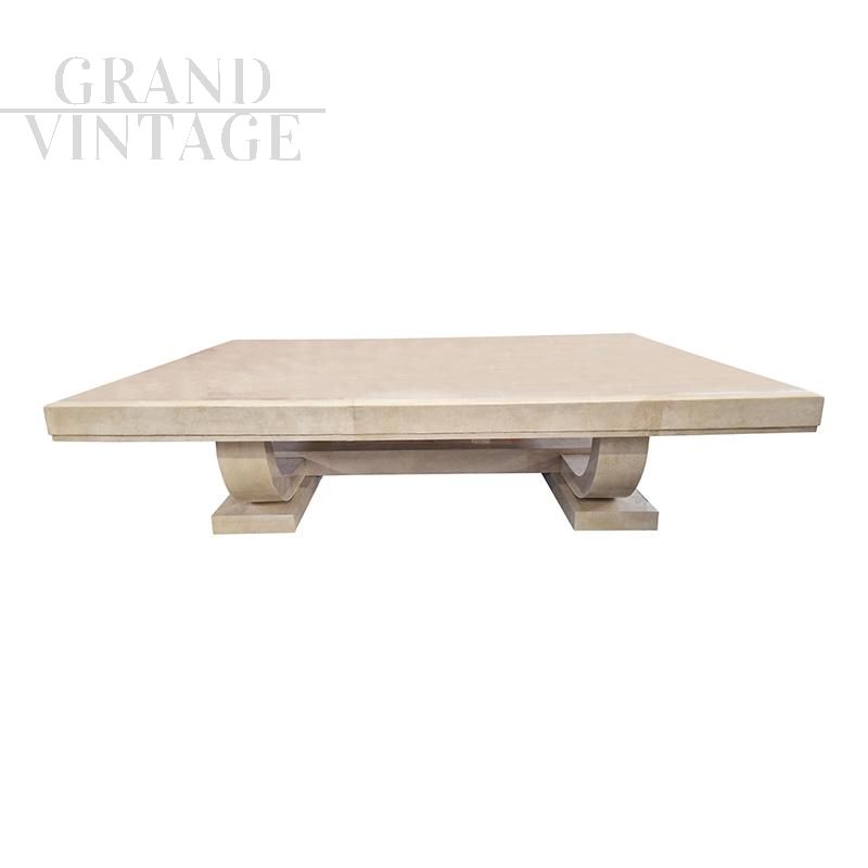 Art Deco style coffee table with wooden structure completely covered in natural parchment, entirely handmade.