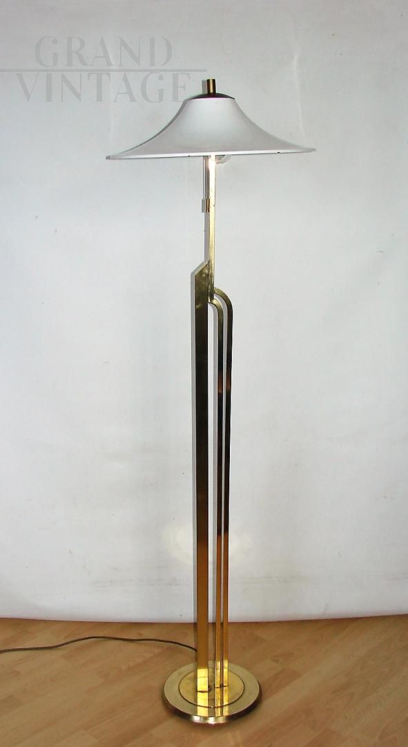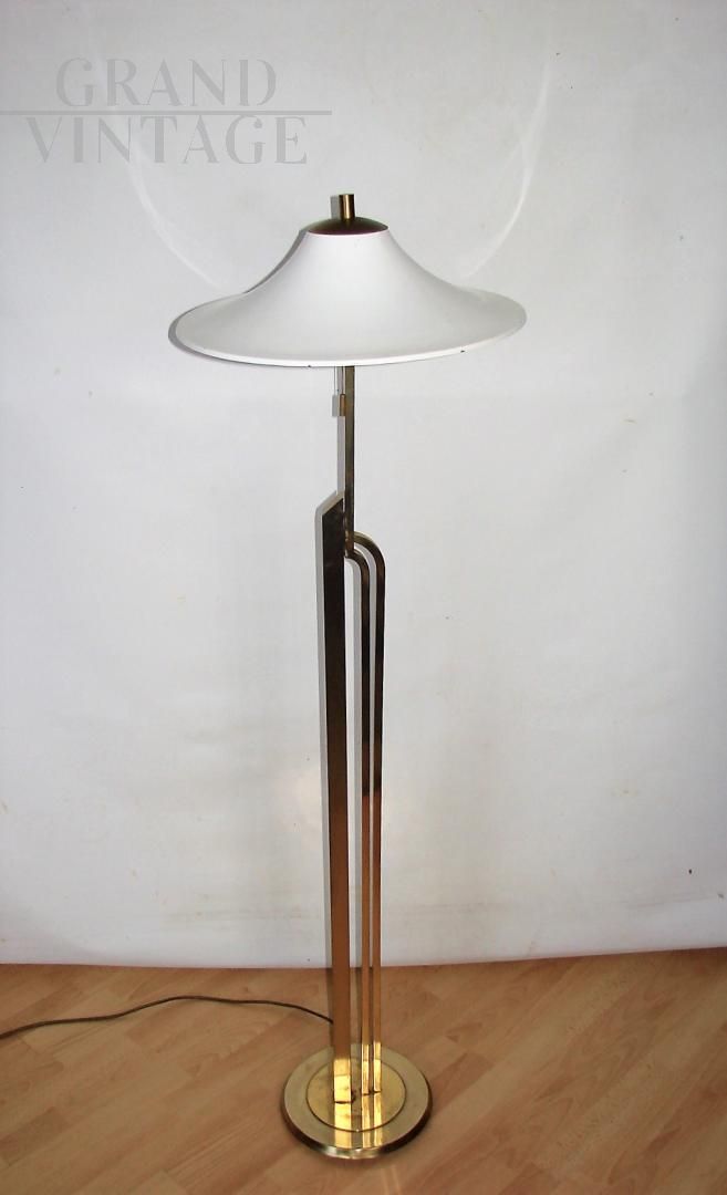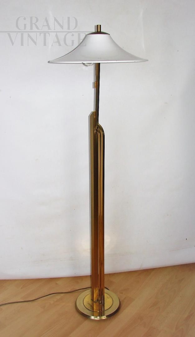 Art Deco style floor lamp from the 60s, with brass structure and white lacquered metal lampshade. The lamp needs 2 E27 bulbs.