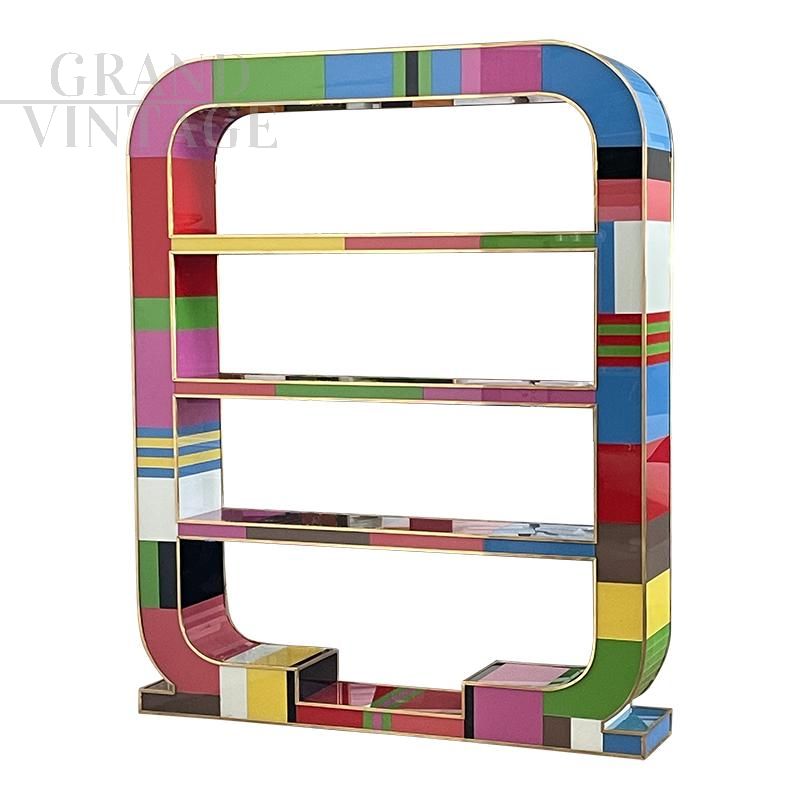 Double-sided open bookcase from the Art Dèco line, entirely handmade with four shelves, wooden structure covered in multicolored Murano glass tiles, golden brass profiles.