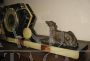 Art Deco table clock in antique marble, triptych with dog, 1930s. Deco model, built with different types of marble and alabaster. Rectangular base of 53 cm with working clock, silver metal dog resting on the base of the clock, and two obelisk ornaments on the sides. Excellent condition, key for winding watch n ° 4 is missing.