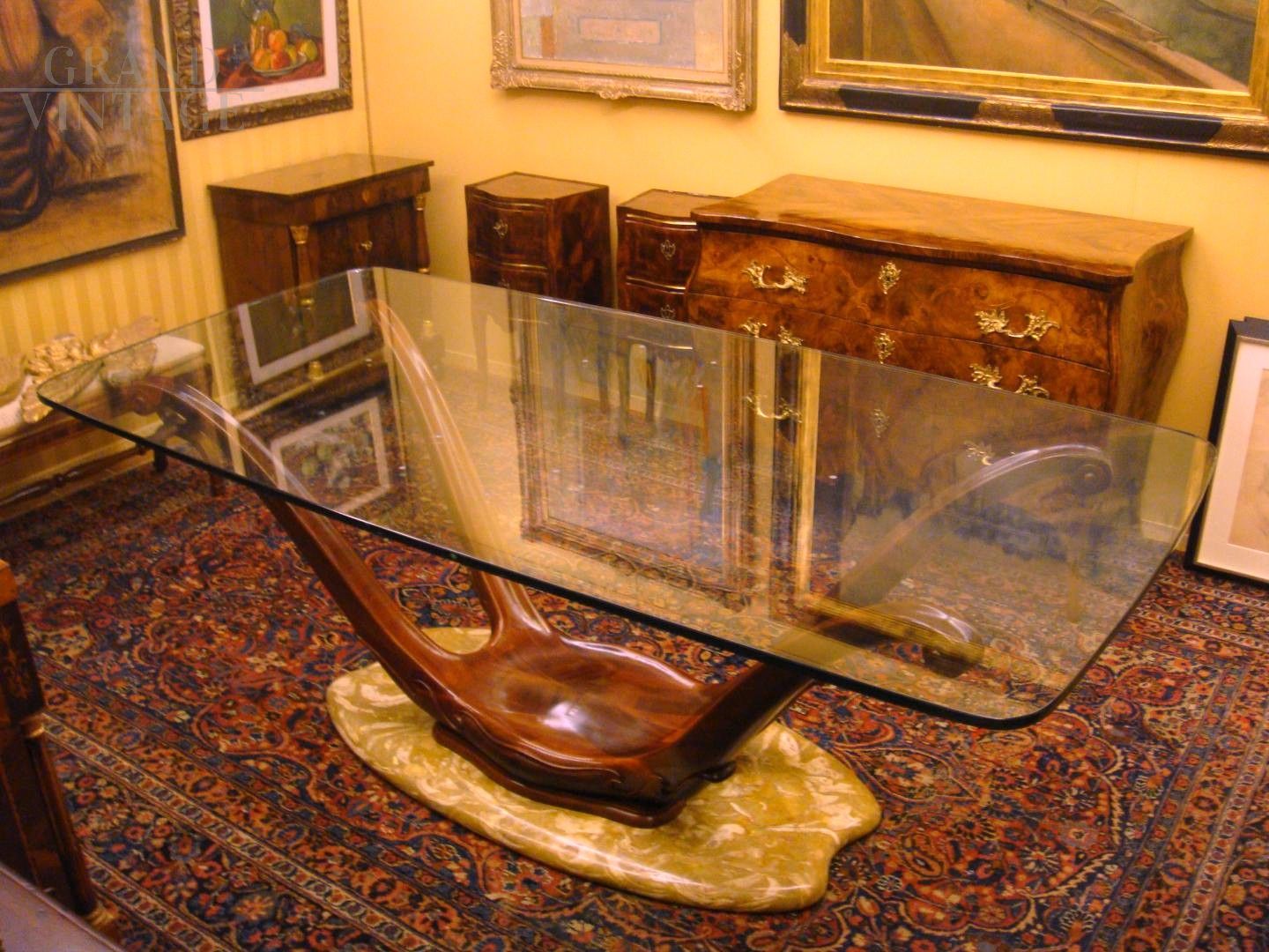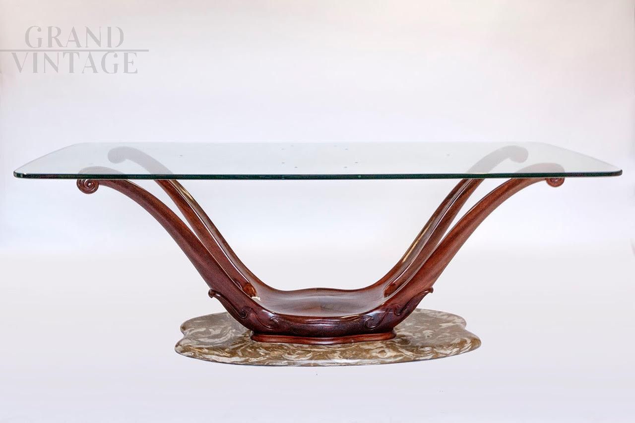 Art Deco table with mahogany and marble base. Marble base, authentic wood and crystal structure. The marble base is ovaloid with a shape along the short sides. The mahogany structure is finely carved on the base. The top is in hand-cut ovaloid crystal, however it has decorative elements on the top probably made in a later period.