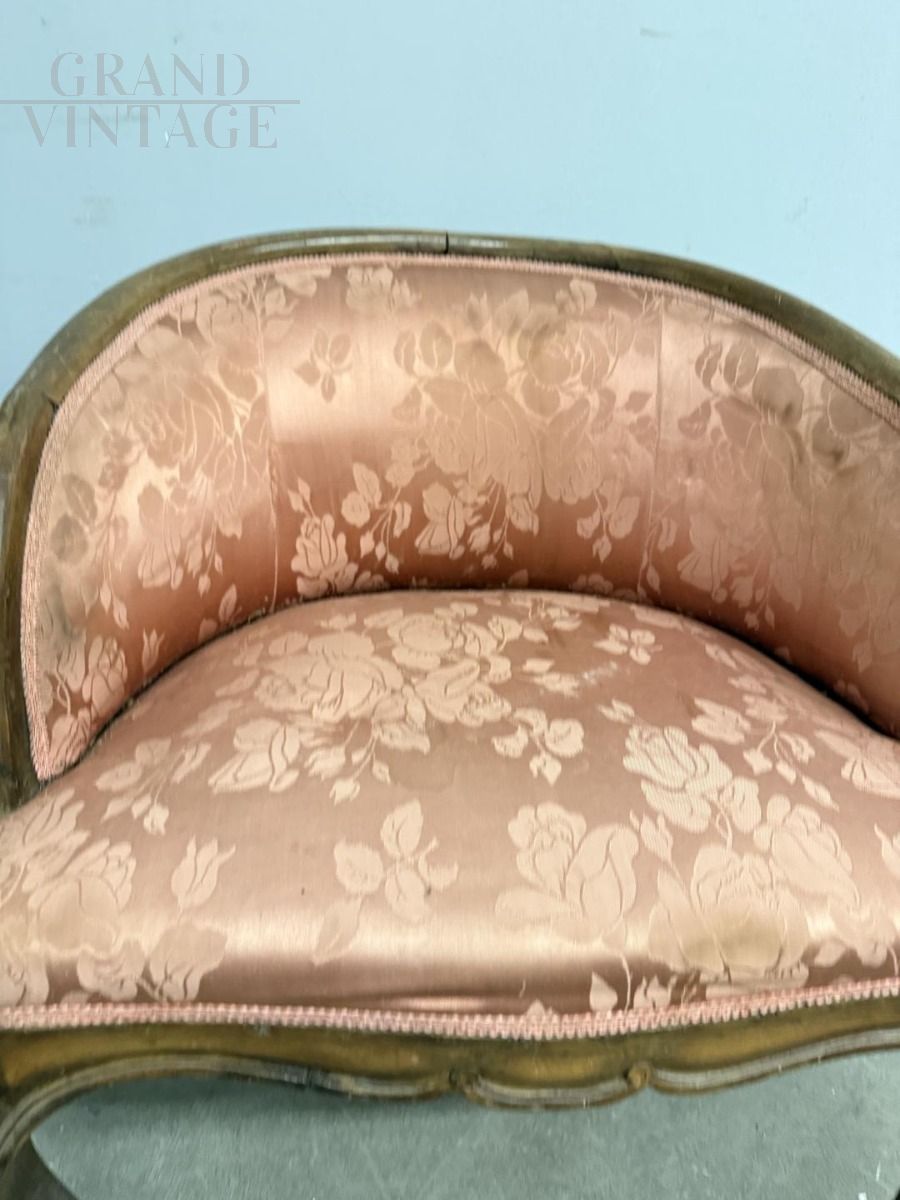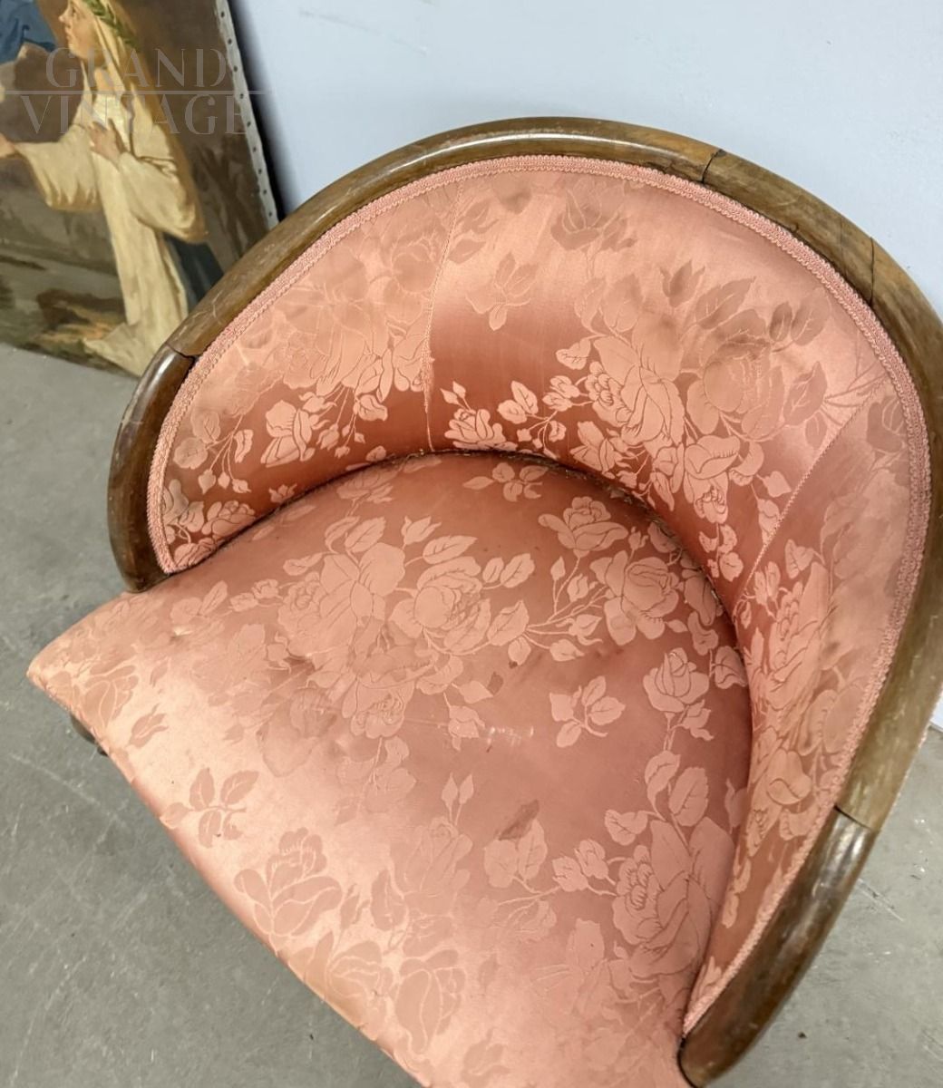 Art Deco tub chair in carved walnut upholstered in original antique pink silk, Italy 1940s. The chair is in its original, unrestored condition, showing natural wear and signs of aging, but its structure is stable and sturdy.