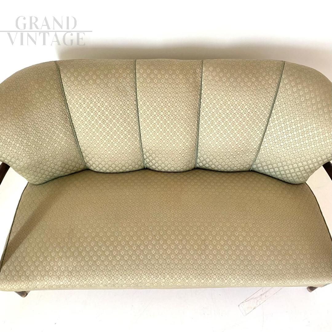 A rare 1950's Art Deco two seater sofa beautifully made in Italy by Malatesta and Mason, upholstered in its original fabric which, despite its age, is in remarkable condition. The beautiful curved frames are made of solid walnut wood. The fabric was cleaned by a professional upholsterer, while the wooden seat frames were polished and repainted in their original colors. In excellent condition, with only some signs of aging.