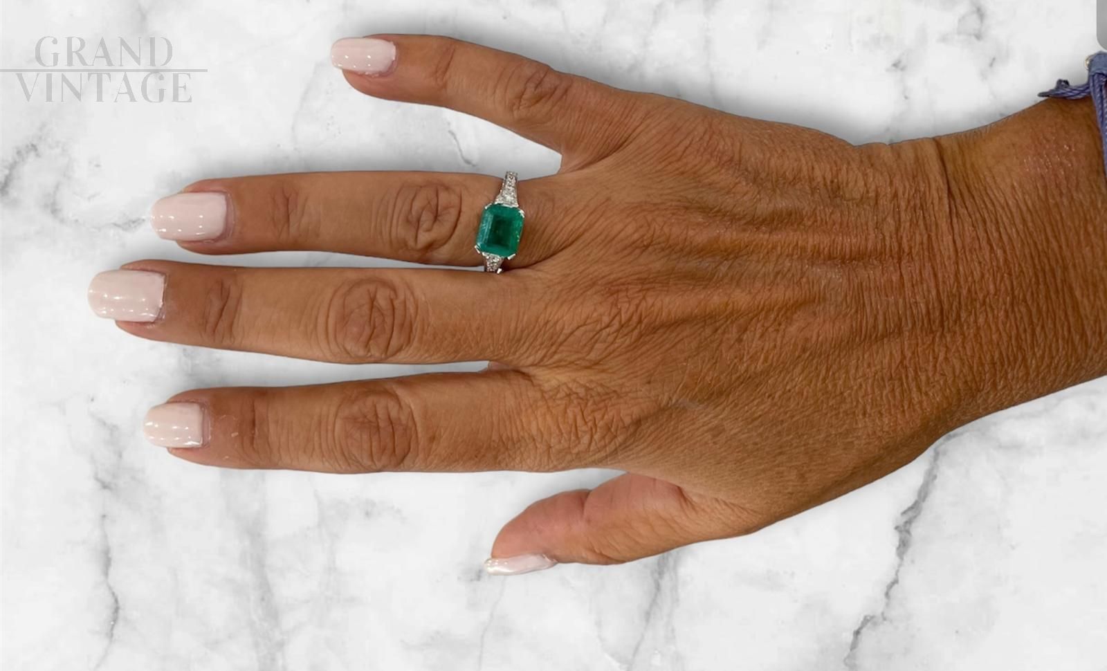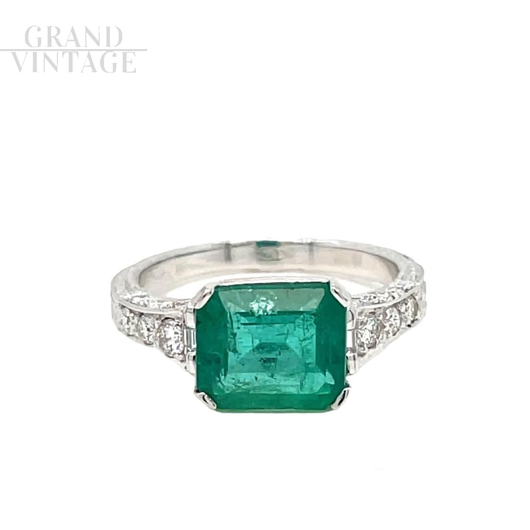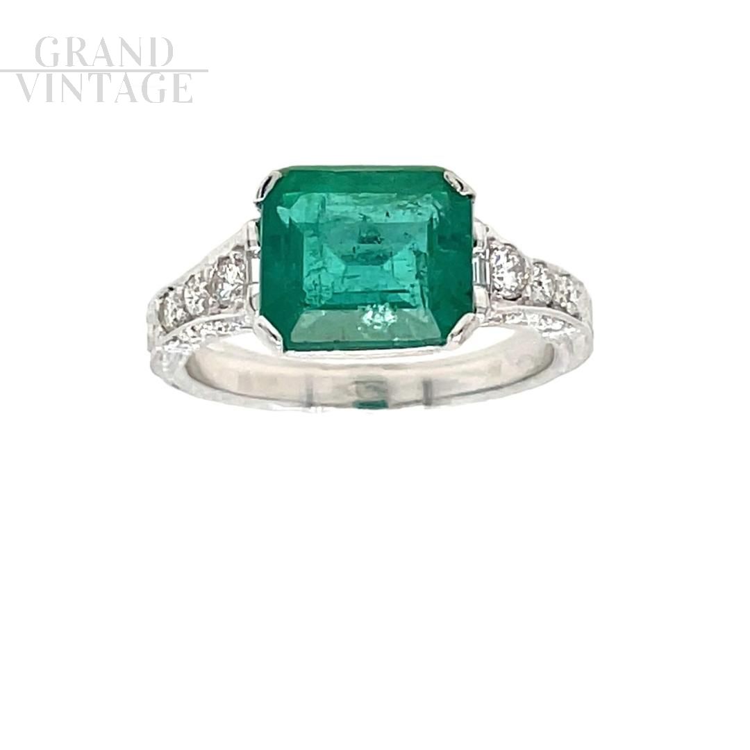 An Art Nouveau Emerald and diamond ring handcrafted in 18k gold. The ring is set with one beautiful emerald cut 2.90 ct Natural Emerald.T hree rows of sparkling old mine cut diamonds are set on the sides of the emerald. The shank of the ring is engraved with floral designs, typical of the Liberty era. Circa 1930
