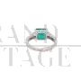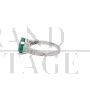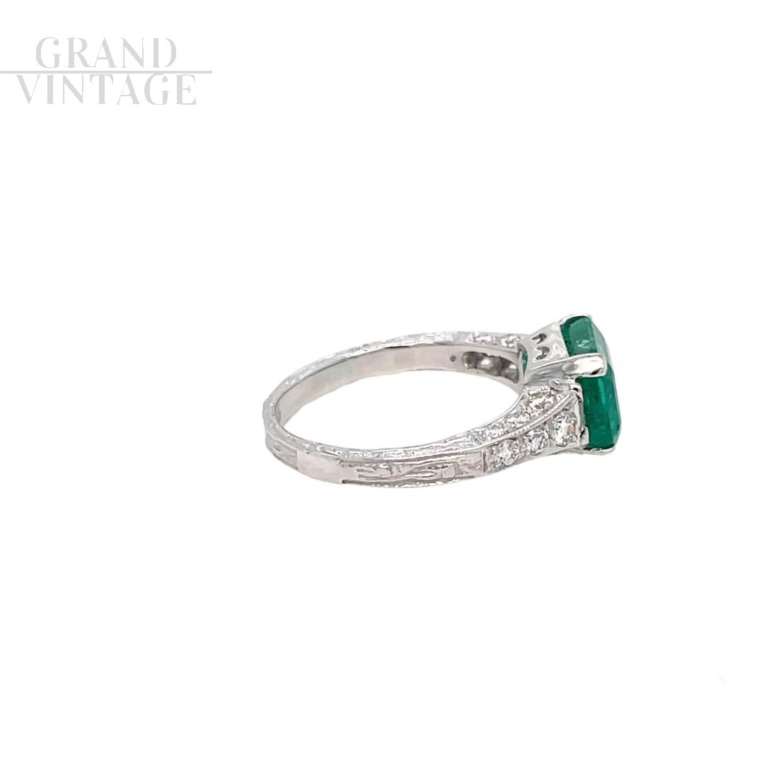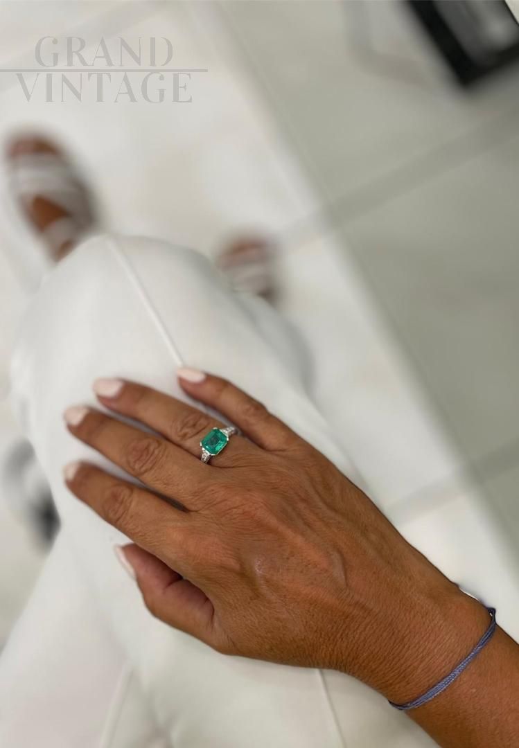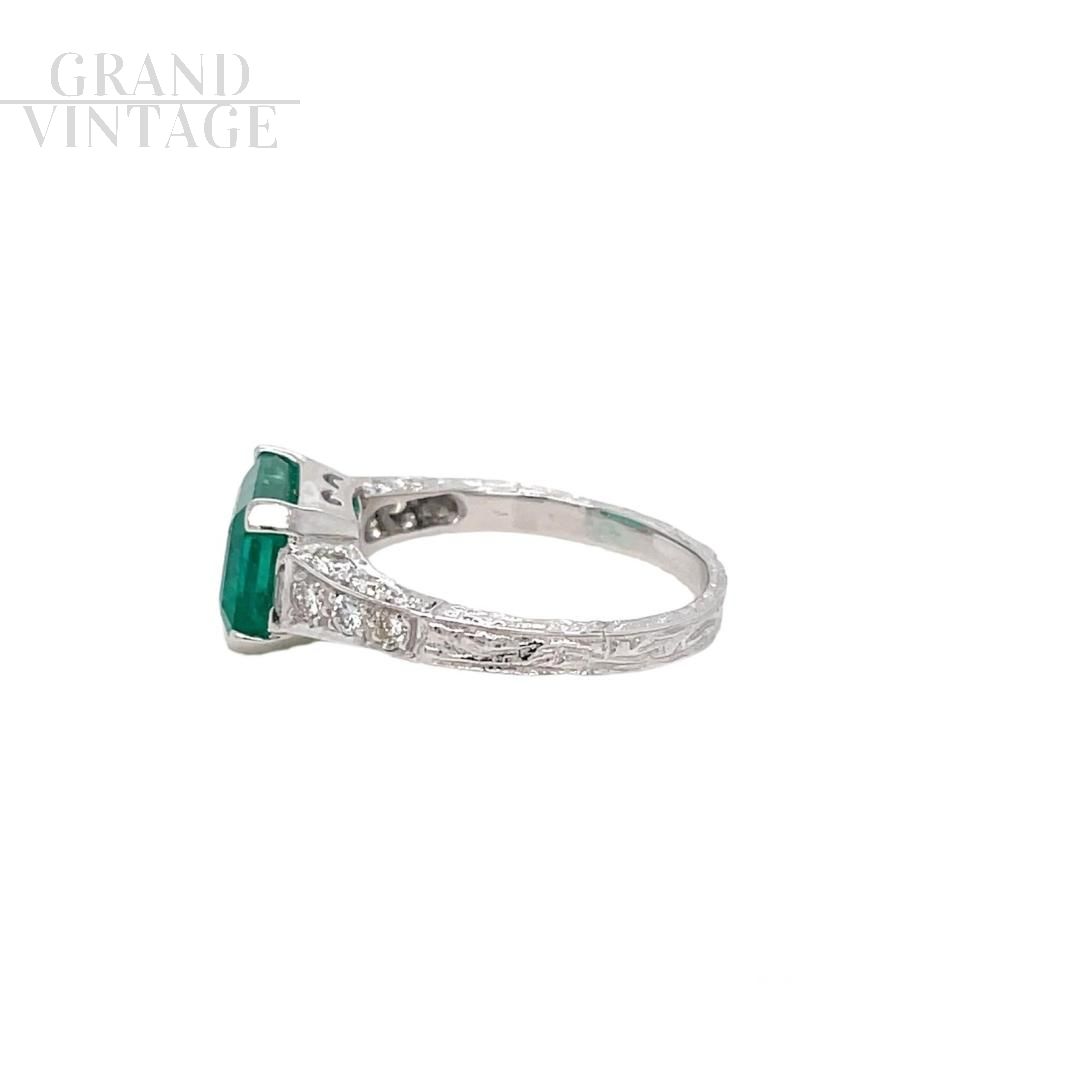 An Art Nouveau Emerald and diamond ring handcrafted in 18k gold. The ring is set with one beautiful emerald cut 2.90 ct Natural Emerald.T hree rows of sparkling old mine cut diamonds are set on the sides of the emerald. The shank of the ring is engraved with floral designs, typical of the Liberty era. Circa 1930