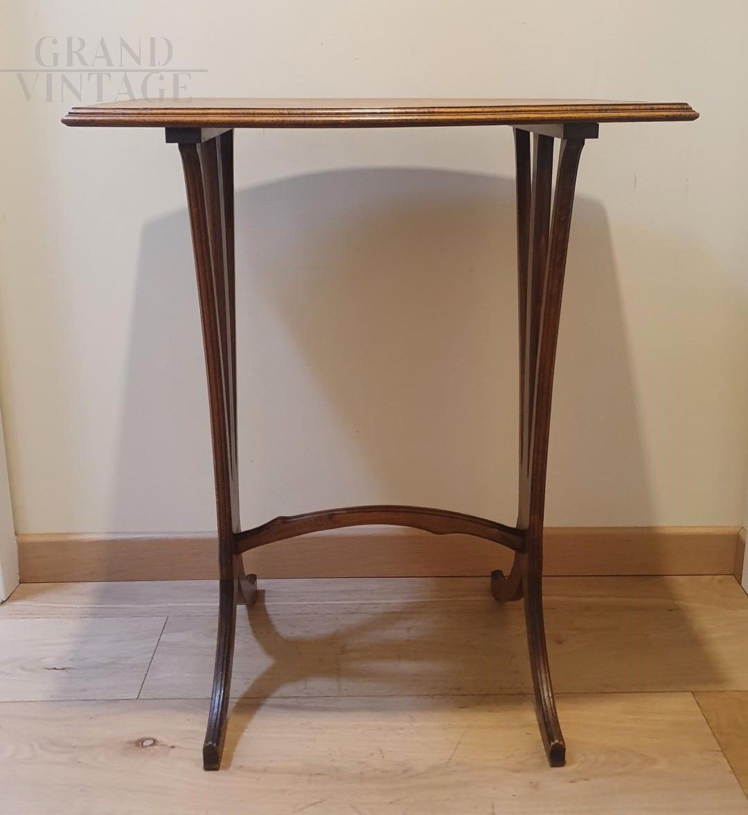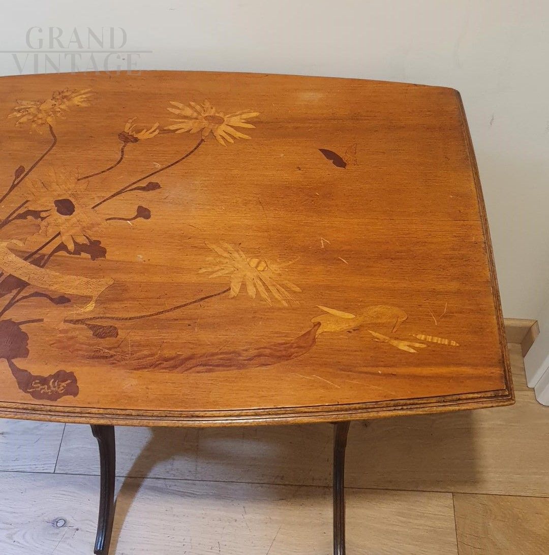 Refined Art Nouveau side table by Émile Gallé in wood with splendid floral inlays with butterfly. The table is signed Gallé and has traces of inscriptions, it has some small professional restoration at the foot of the table with minimal general instability and small defects on the top visible from the photos.