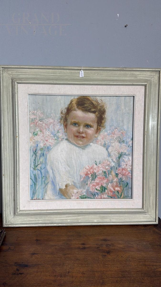 Art Nouveau oil painting on canvas depicting the portrait of a little girl with flowers, signed, in excellent condition, complete with later frame measuring 75 x 73 cm, canvas only measuring 57 x 50 cm.