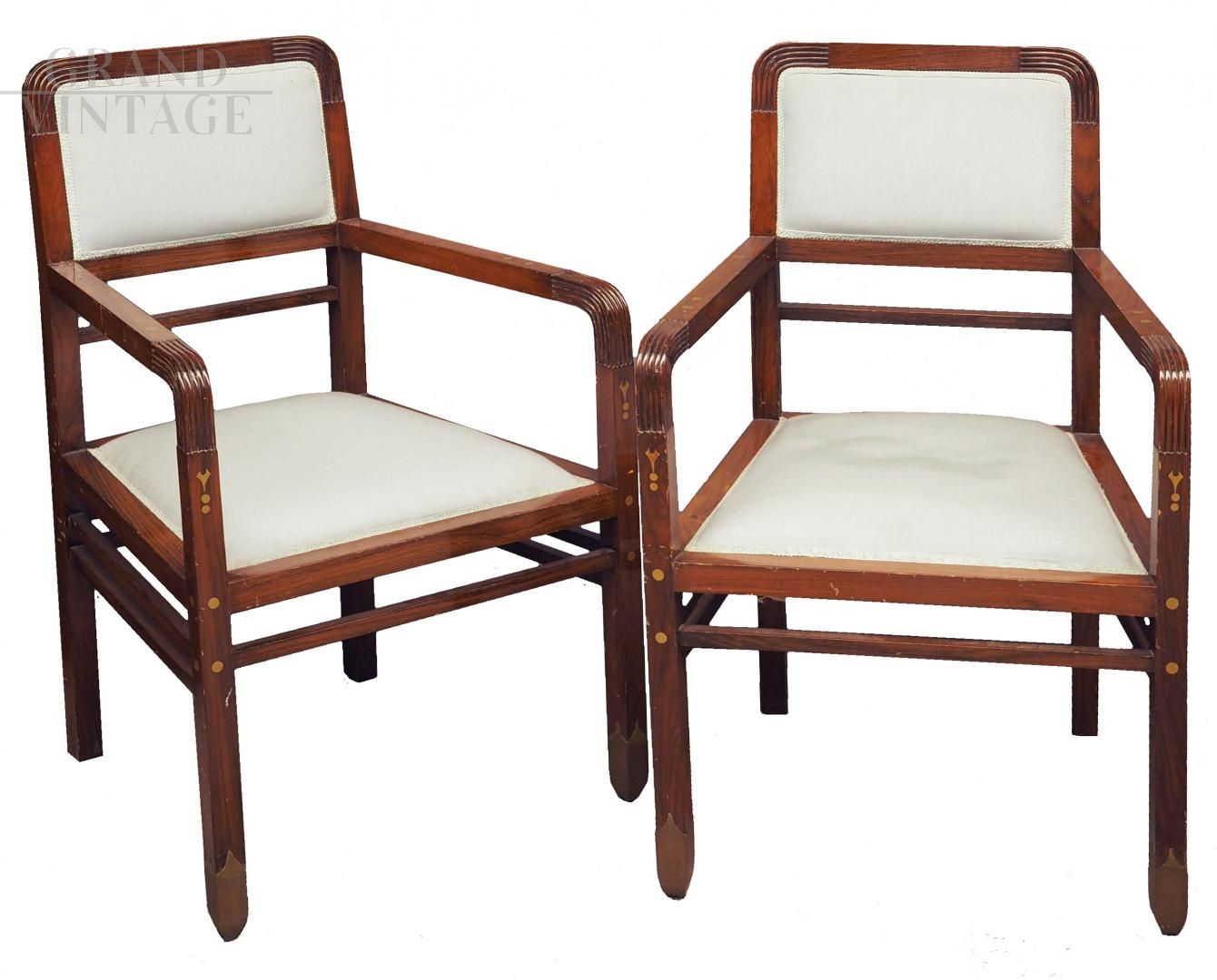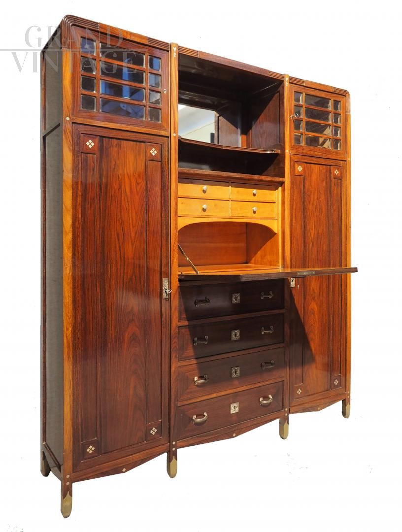 Art Nouveau Liberty studio set by Piero Zen consisting of a bookcase, a desk, two armchairs and a throne chair, Zen Milano manufacture. The bookcase has two large side doors, central drawers and a drop-down escritoire desk with leather top. Piero Zen, son of Carlo Zen (1851-1918), was one of the most important designers and producers of Art Nouveau furniture in Italy. This rare and important studio appears for the first time on the market in a very good state of conservation (armchairs to be revised in the padding).