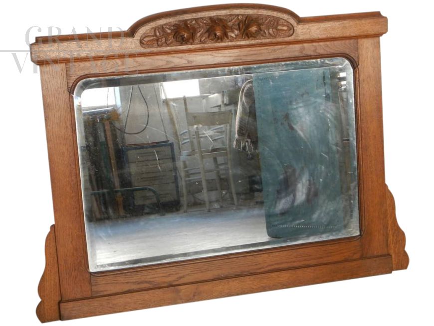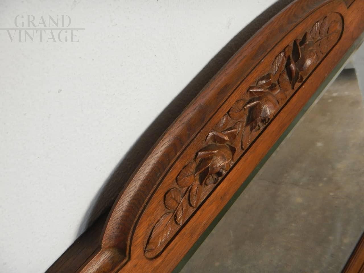 Art Nouveau style mirror with carved oak frame and beveled mirror, 1960s.